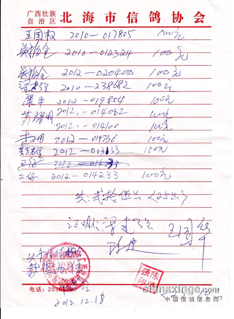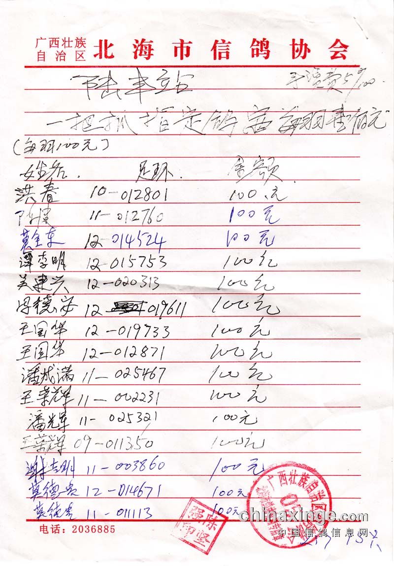 广西北海市信鸽协会陆丰站100元组指定鸽名单