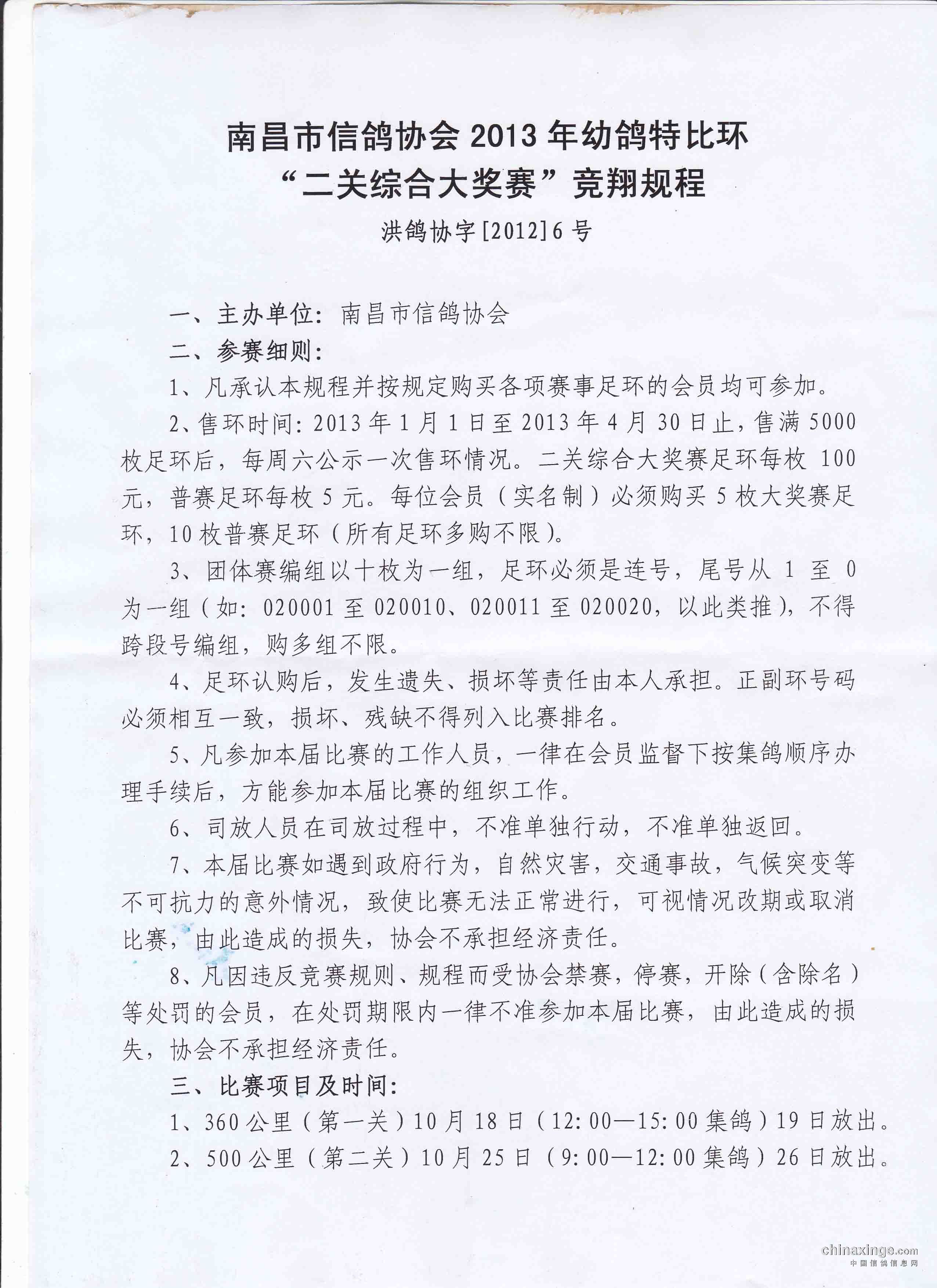 南昌市信鸽协会2013年幼鸽特比环“二关综合大奖赛”竞翔规程