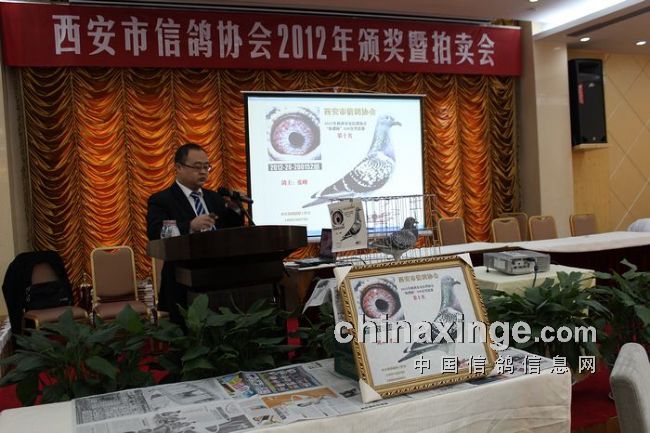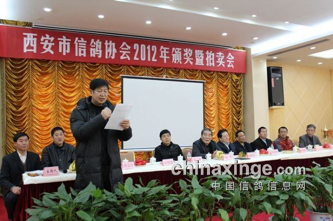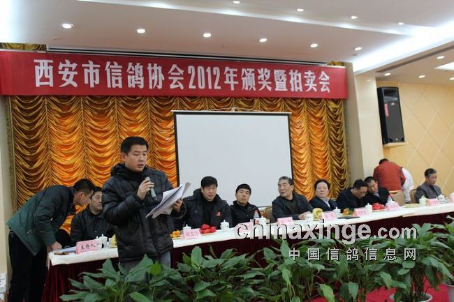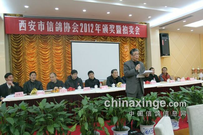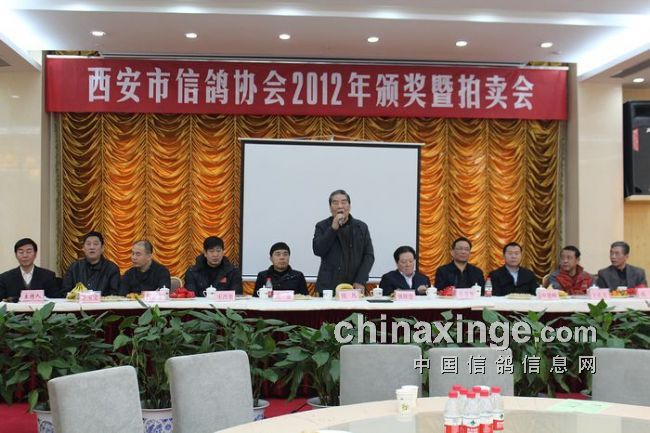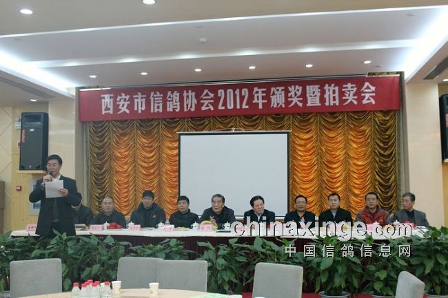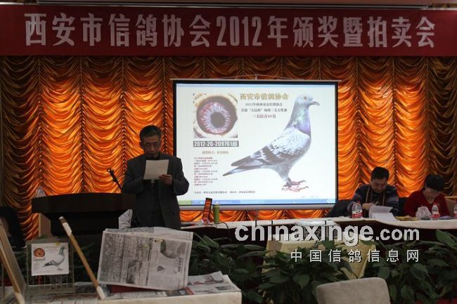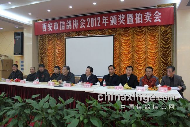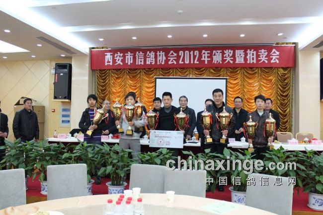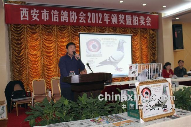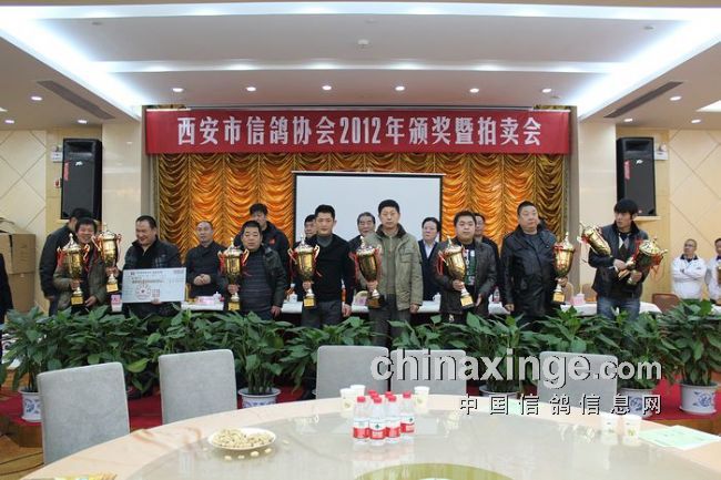 西安市信鸽协会2012年度颁奖暨拍卖大会于2012年12月29日在芷园饭店迎宾厅隆重召开,西安市信鸽协会主席何志方,西安市体育局秘书长宋西荣、名誉主席张凡、吴一坚、姚联盟、仲睿智,副主席王玉文、高汉、秘书长王长安,副秘书长兼办公室主任李小刚出席会议。会议现场热烈和谐,鸽友踊跃举牌拍鸽,共拍出“和谐杯”“阳光威力杯”“大运杯”获奖赛鸽175羽,拍卖总额创出141万6千元的新记录。
