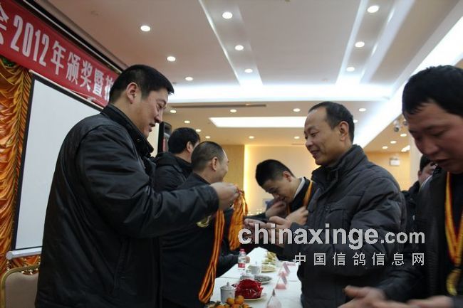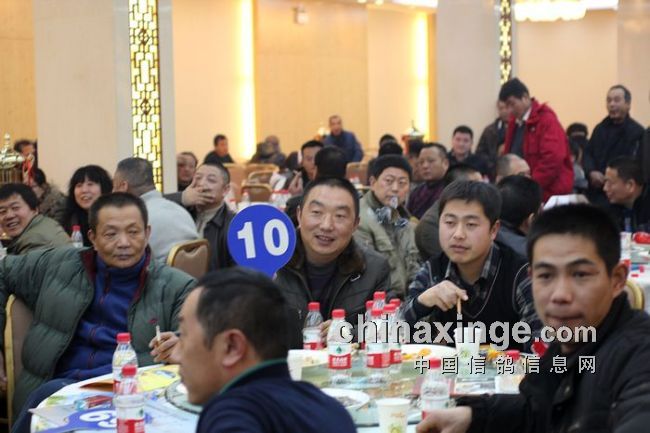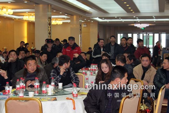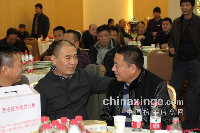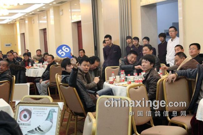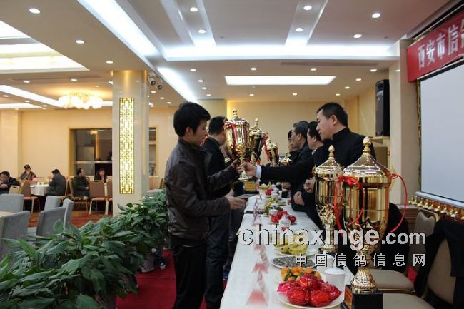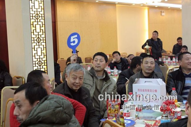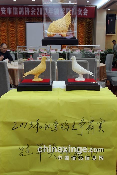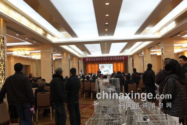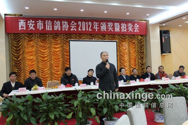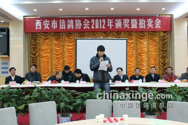 西安市信鸽协会2012年度颁奖暨拍卖大会于2012年12月29日在芷园饭店迎宾厅隆重召开,西安市信鸽协会主席何志方,西安市体育局秘书长宋西荣、名誉主席张凡、吴一坚、姚联盟、仲睿智,副主席王玉文、高汉、秘书长王长安,副秘书长兼办公室主任李小刚出席会议。会议现场热烈和谐,鸽友踊跃举牌拍鸽,共拍出“和谐杯”“阳光威力杯”“大运杯”获奖赛鸽175羽,拍卖总额创出141万6千元的新记录。