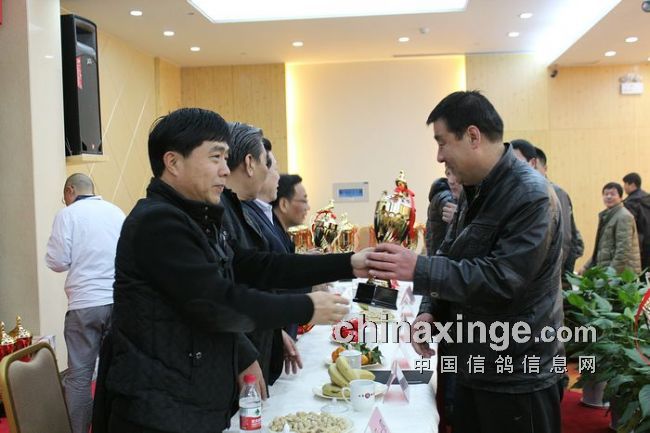 西安市体育局秘书长宋西荣先生(左)为年度最佳鸽舍金花鸽舍颁奖