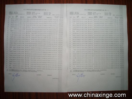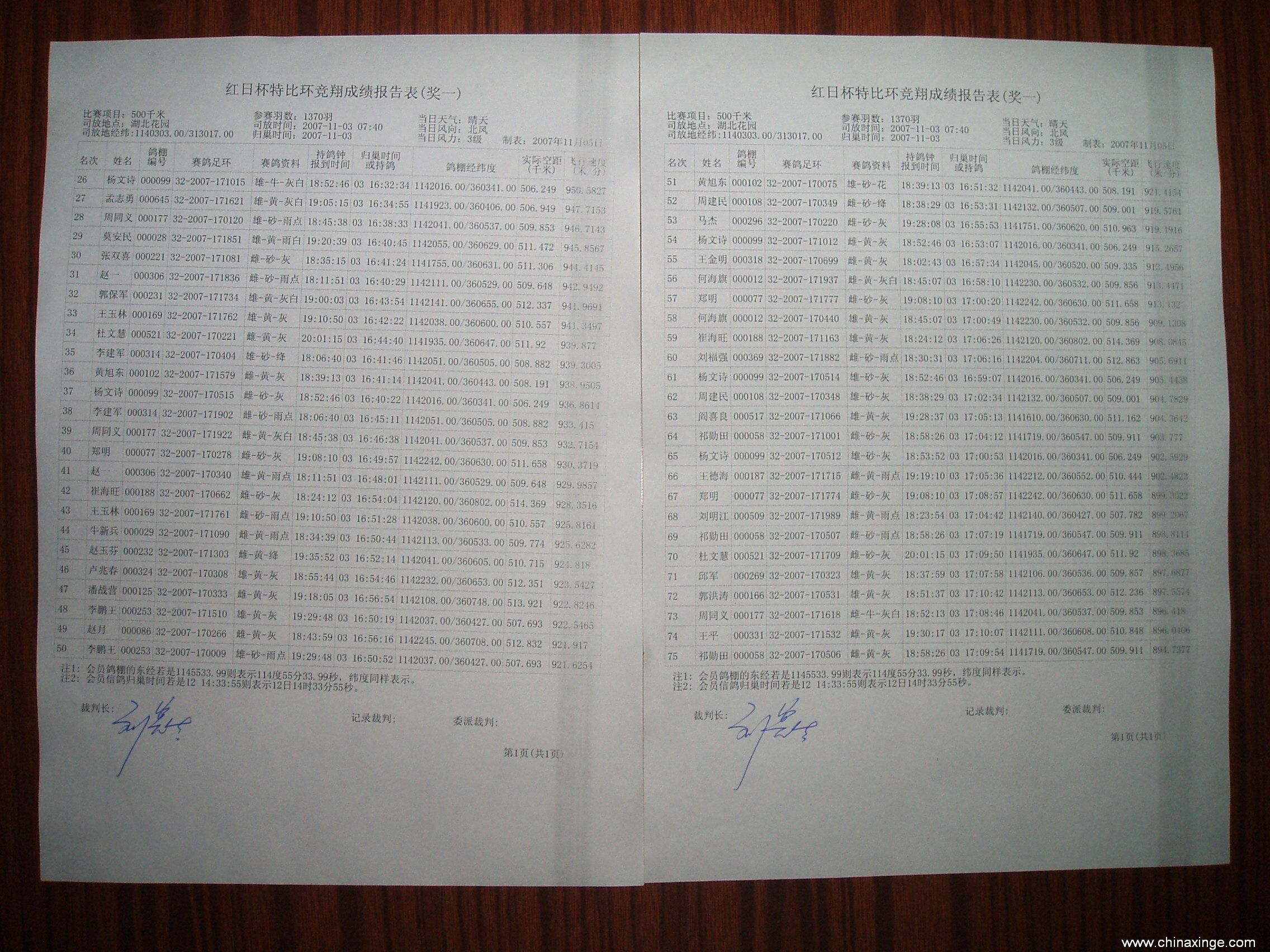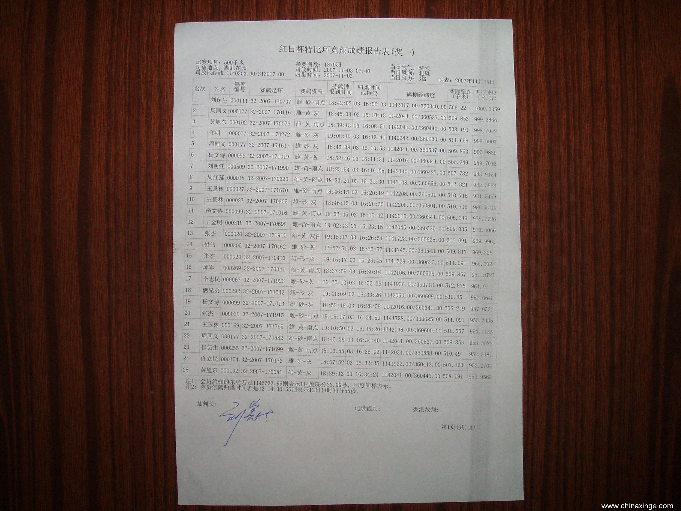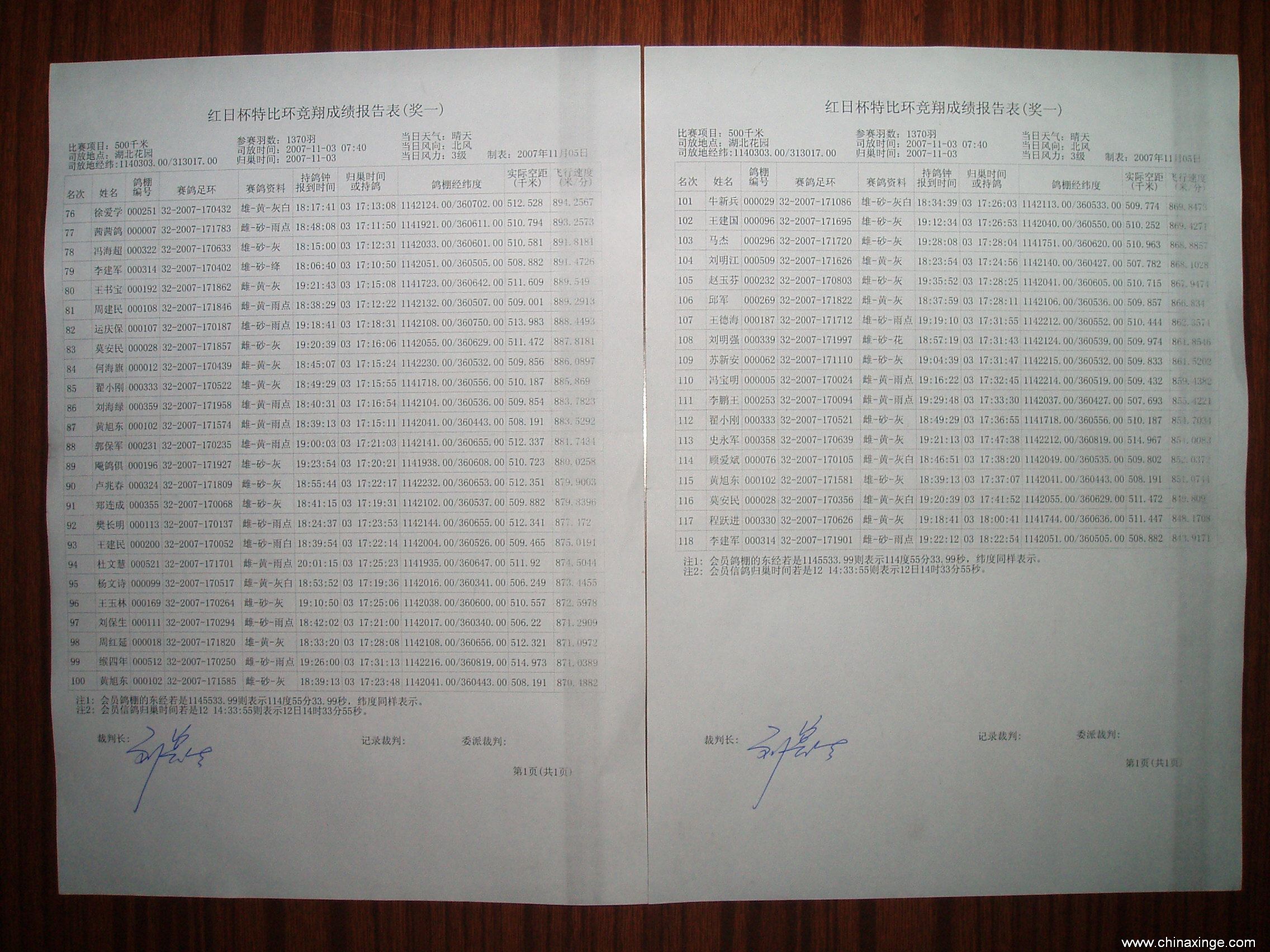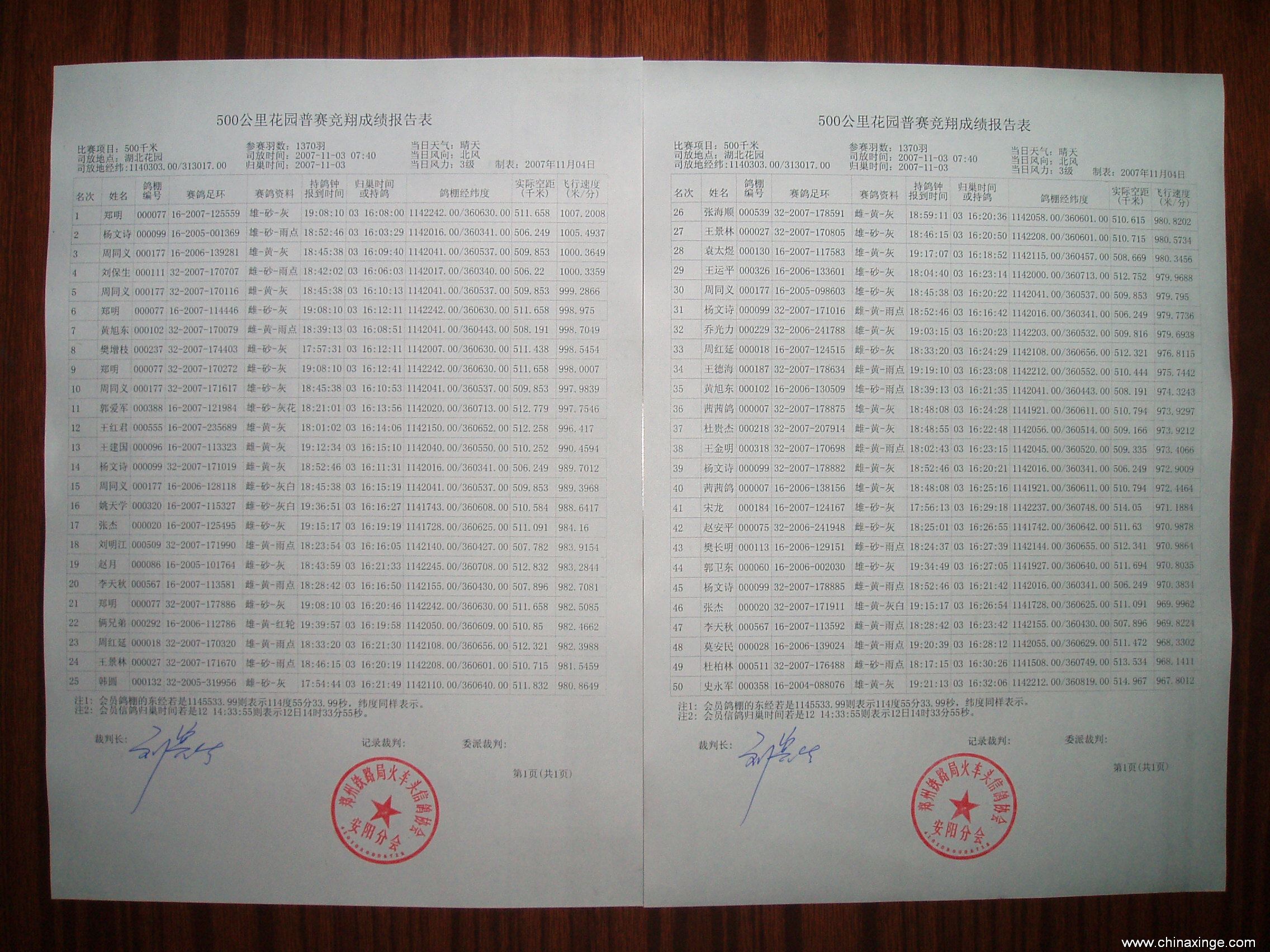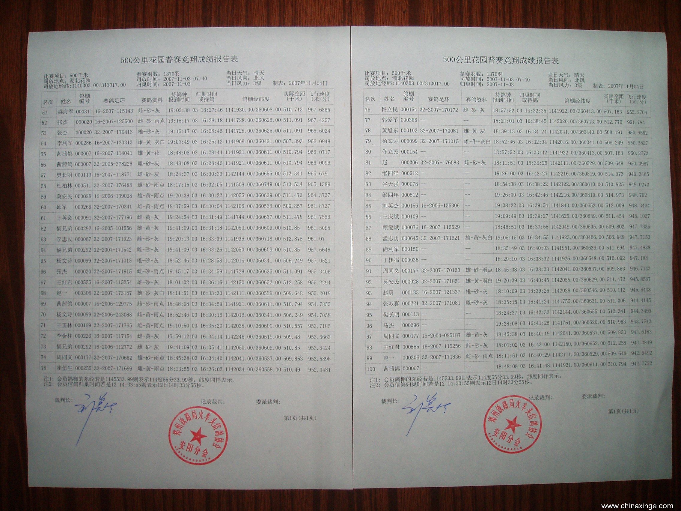 本次比赛得到了会员朋友的热情参与,共集鸽1370羽(红日杯528羽),当日归巢报进377羽(红日杯123羽,有效成绩118羽).比赛取得圆满成功!现将各项成绩单上传,请会员查阅.(鼠标左键双击图片可放大)
