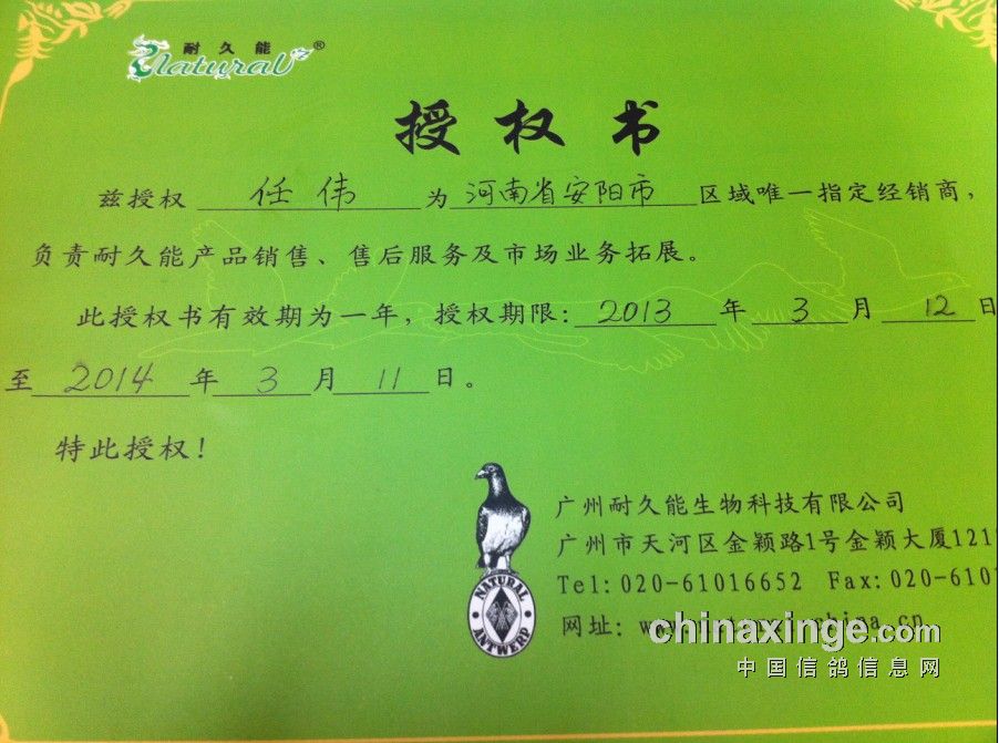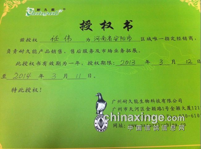 恭贺我会会员任伟先生,成为上海龙园鸽药、耐久能鸽