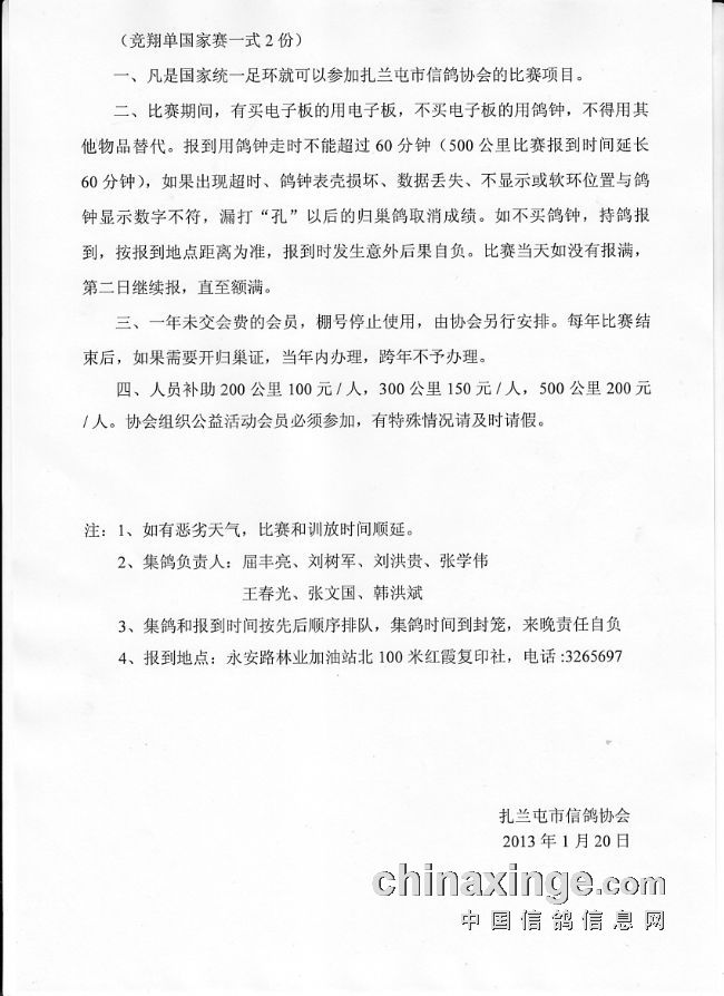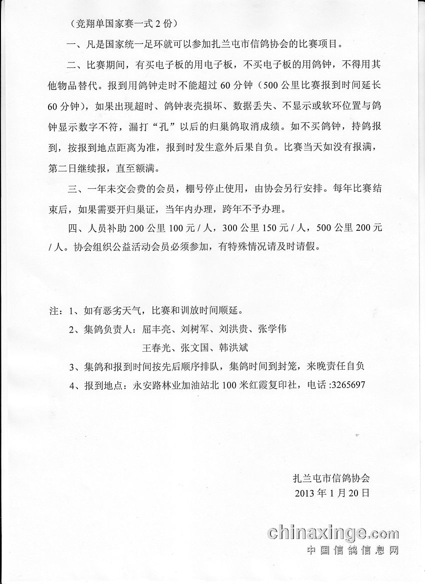 2024年呼伦贝尔市扎兰屯信鸽协会竞翔计划