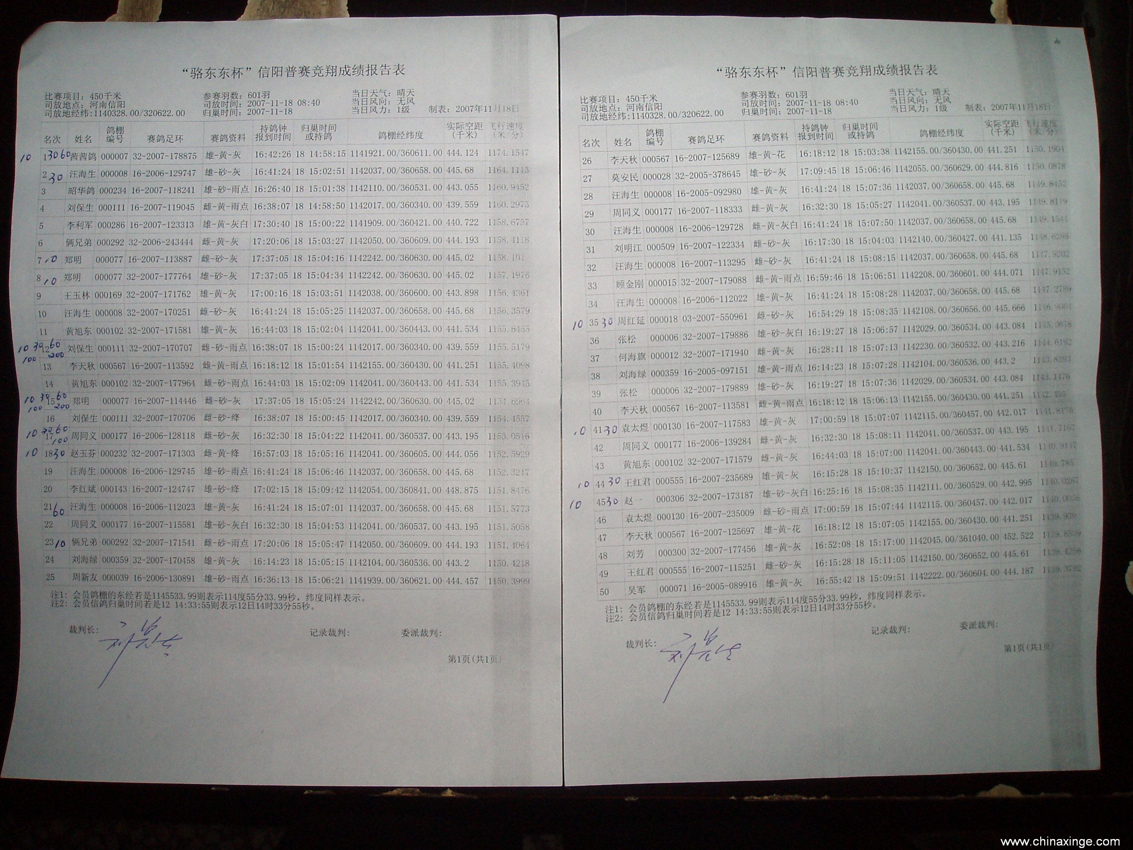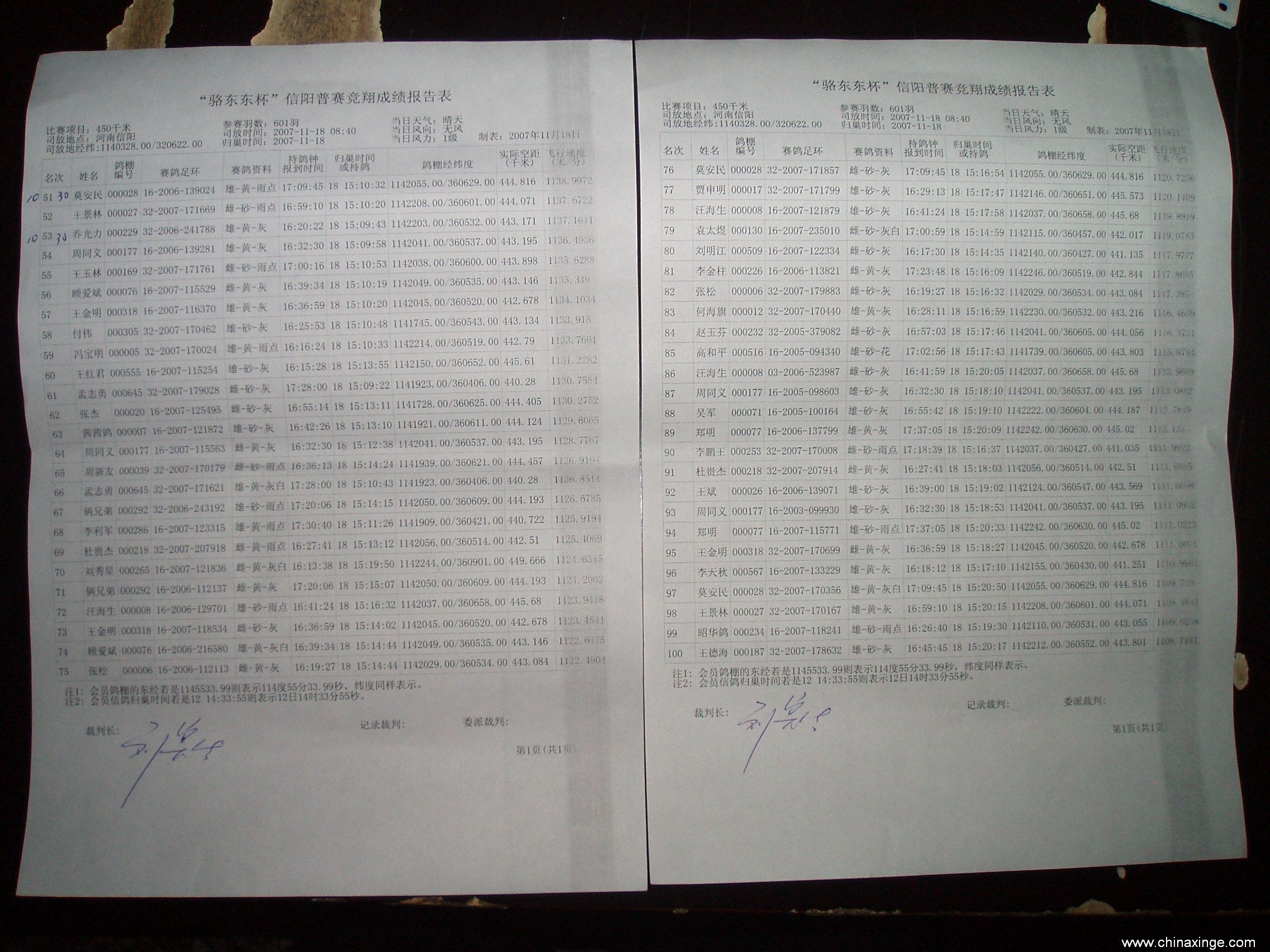 安阳市铁路信鸽协会07秋450公里信阳"骆东东杯"1-100名成绩单