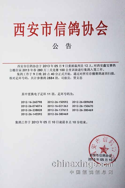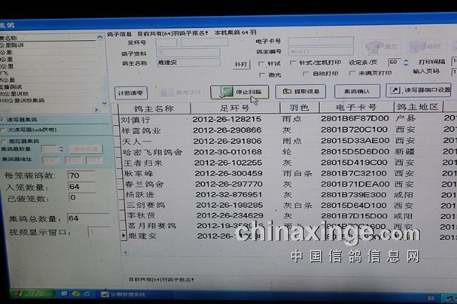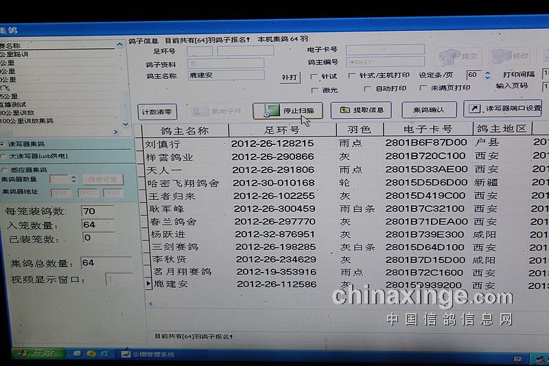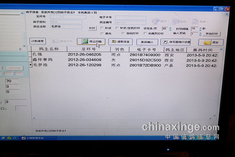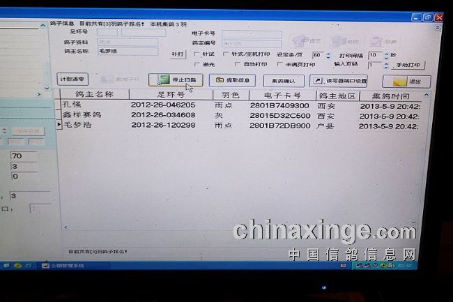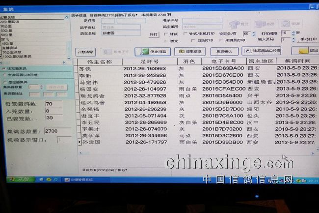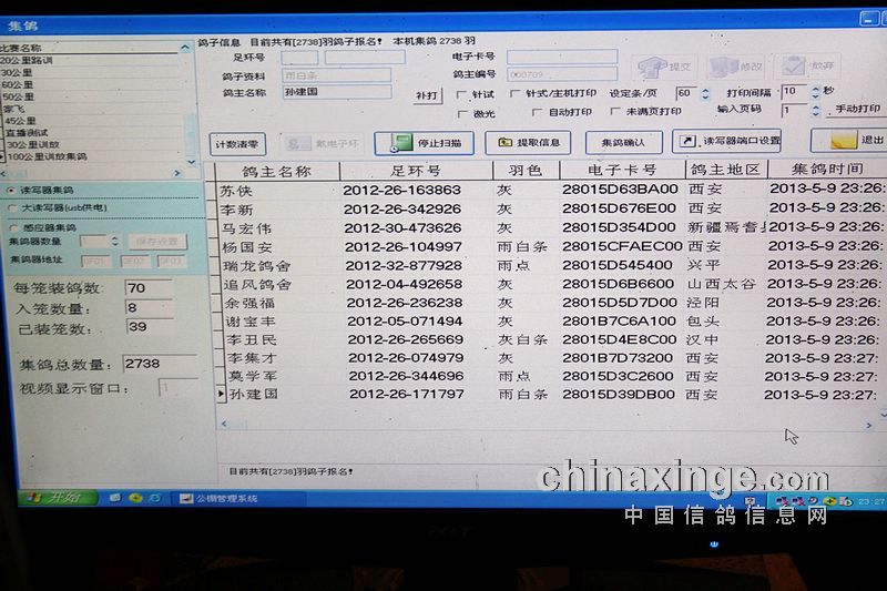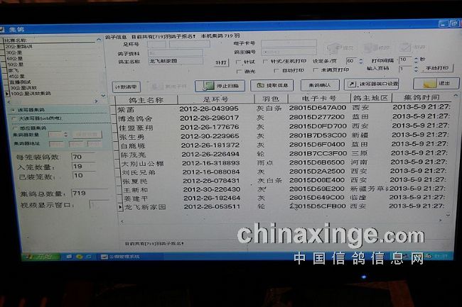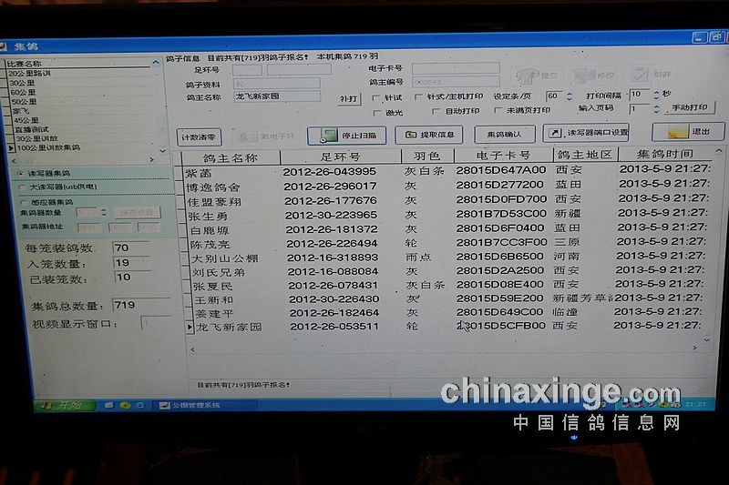 截止2013年5月9日晚21点27分已经扫描入笼719羽参赛鸽