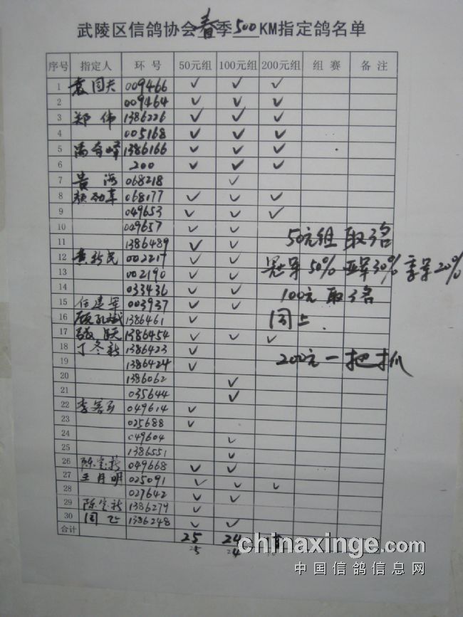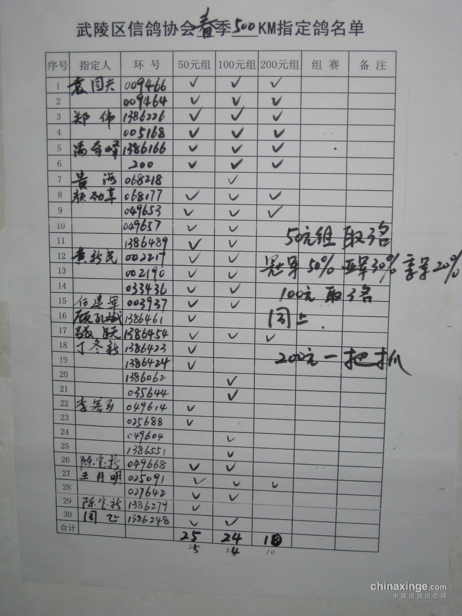 武陵鸽协2013年春季500公里指定鸽子明细表
