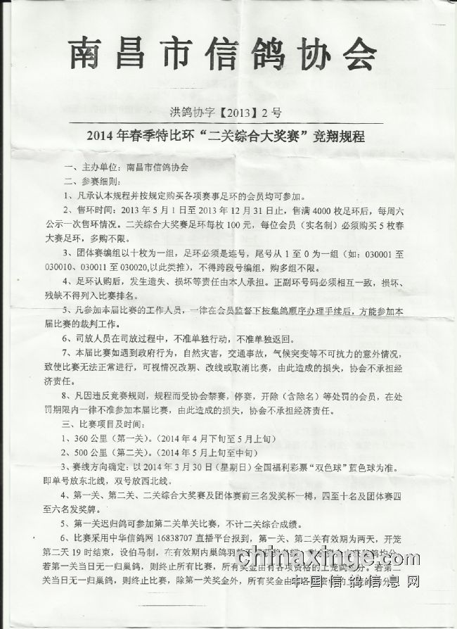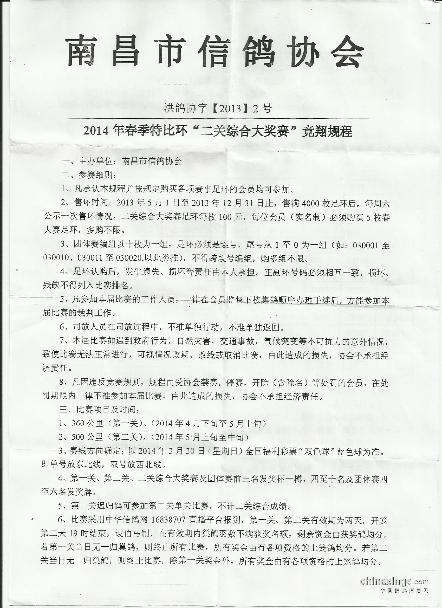 2014年春季特比环“二关综合大奖赛”竞翔规程