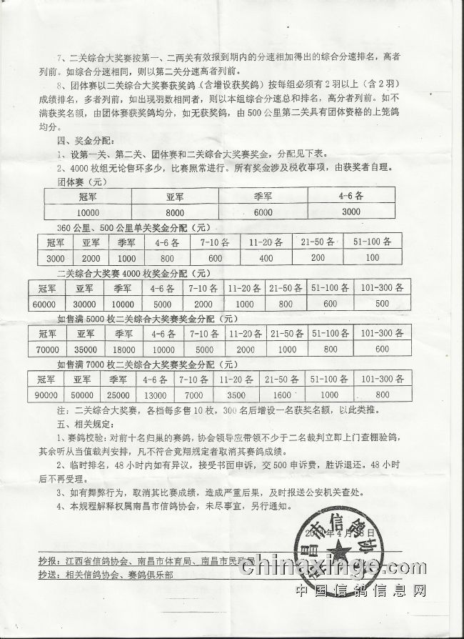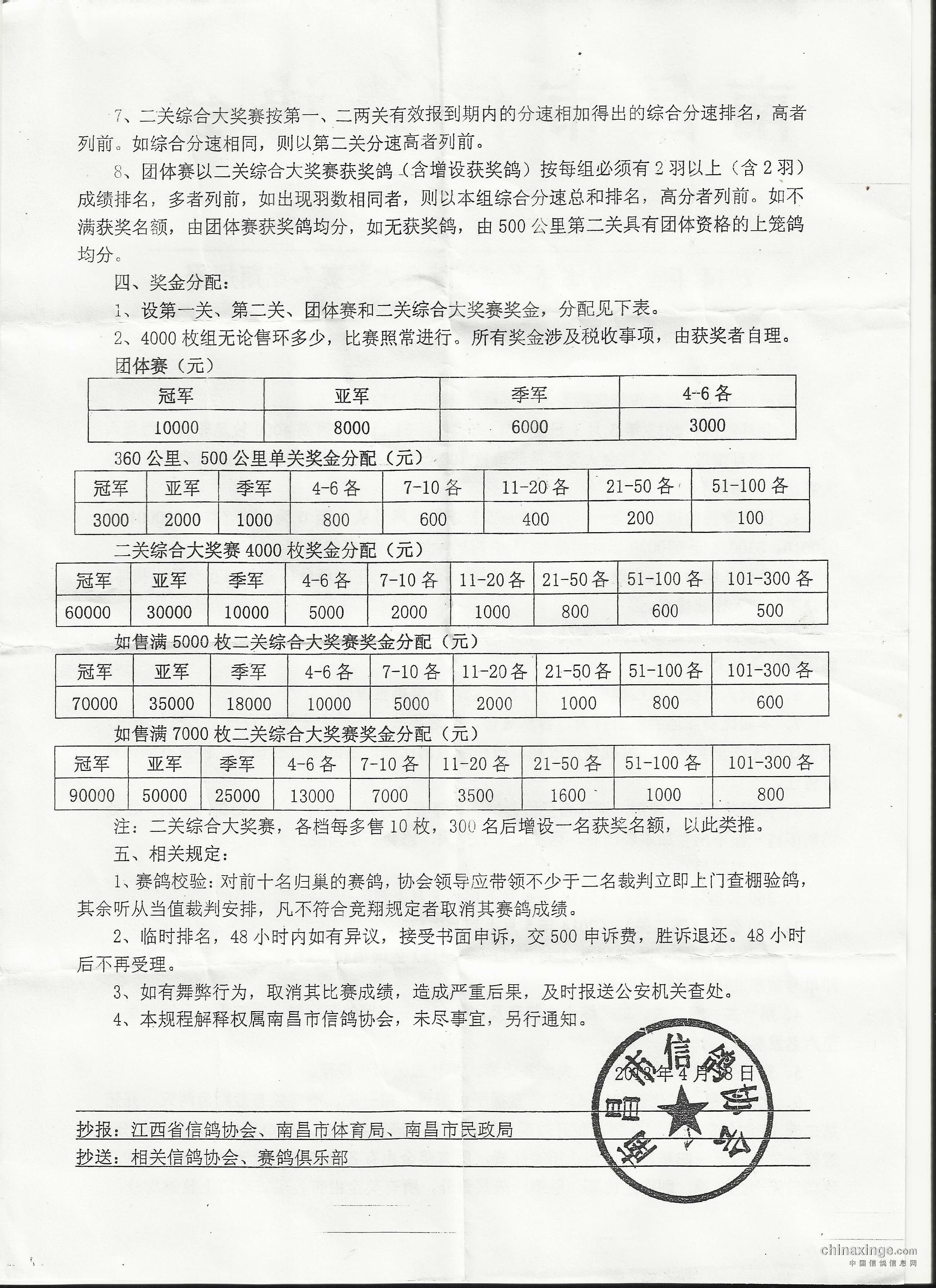南昌市信鸽协会春季大赛500公里第二关成绩