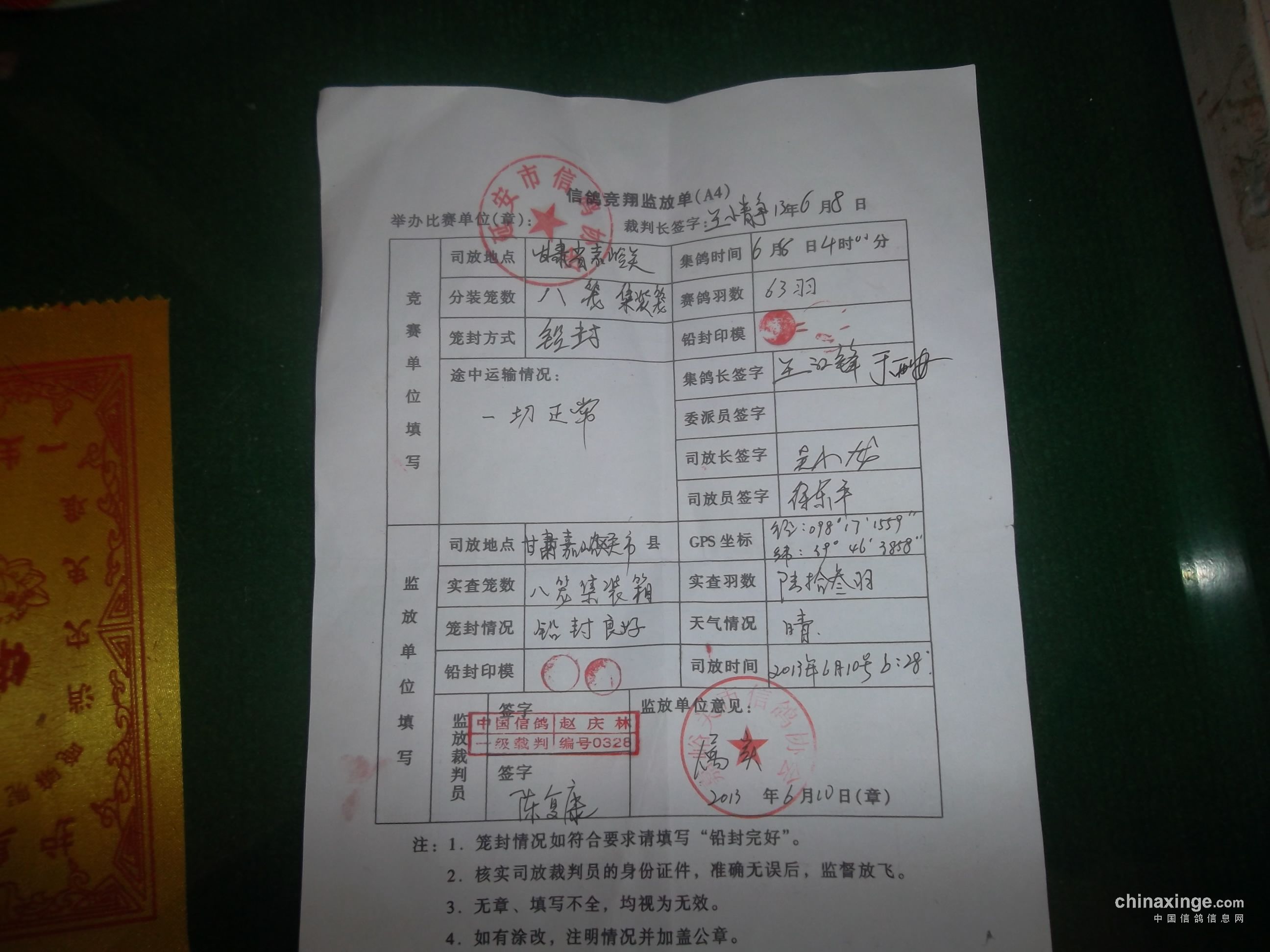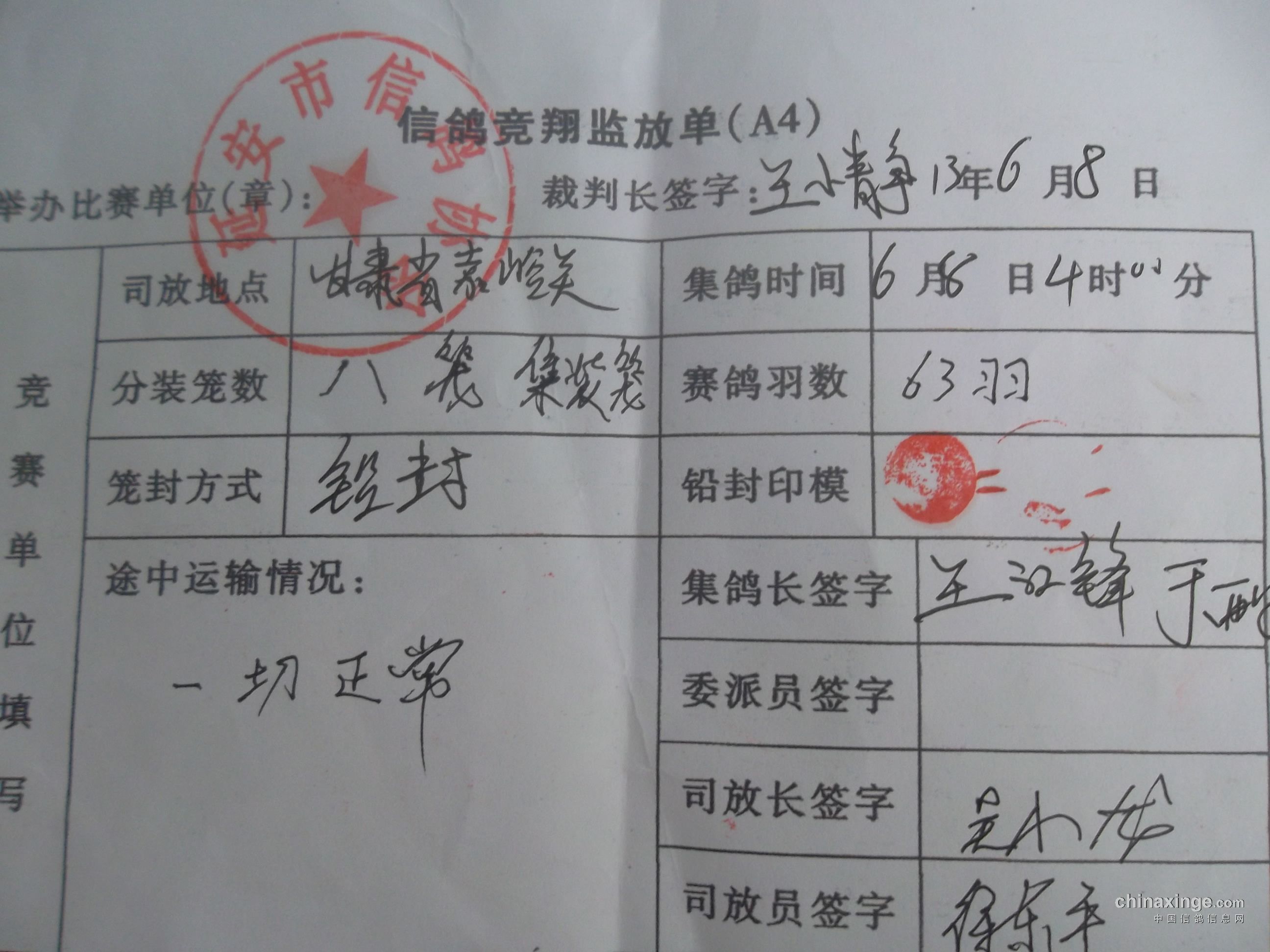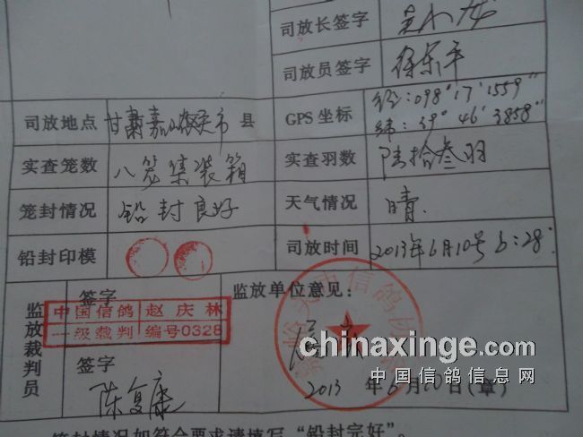 2013年延安市信鸽协会春季第三关甘肃嘉峪关站比赛竟翔监放单