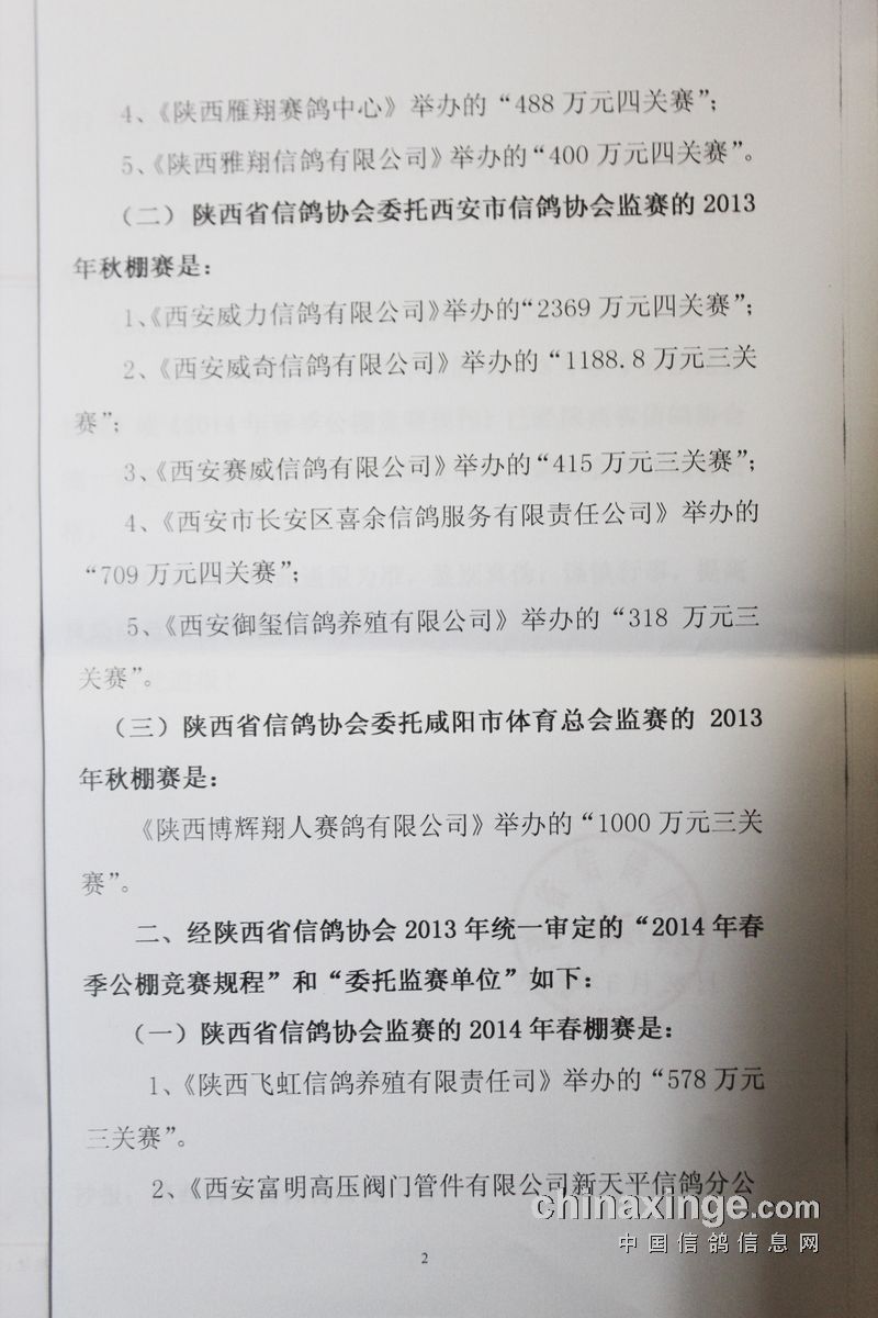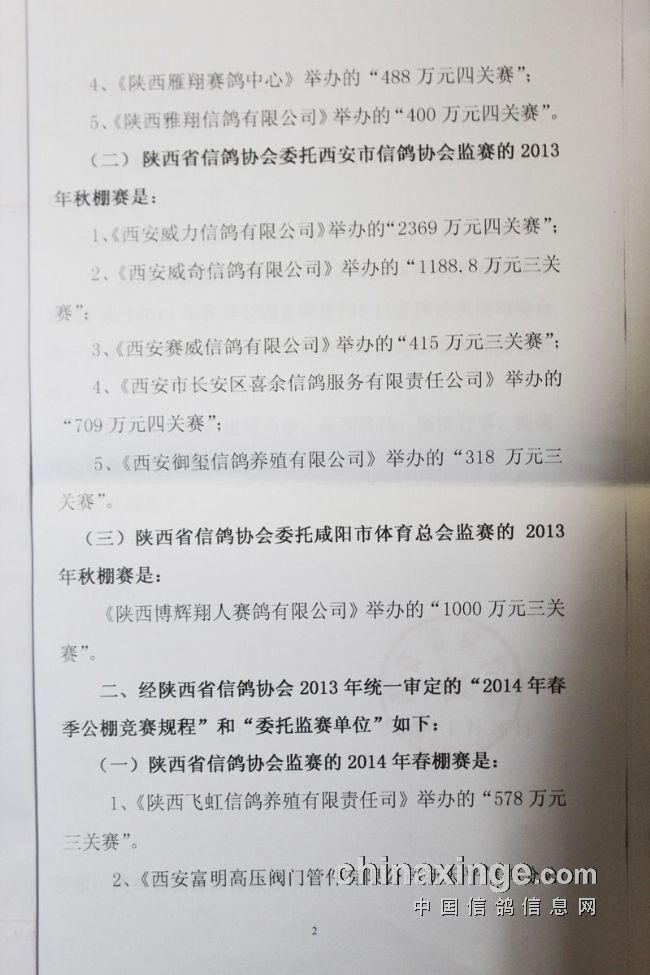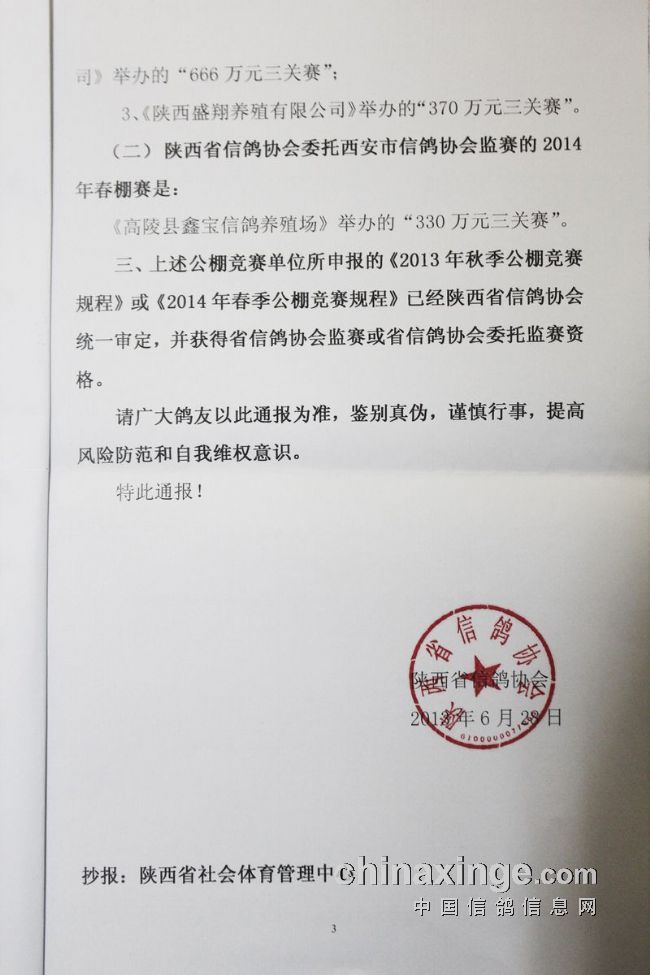 二是依照以往惯例各公棚竞赛单位向协会填写报送《举办公棚竞赛申请表》由省鸽协审定的公棚竞赛单位《竞赛规程》,竞赛《承诺书》,以及《企业法人营业执照》、《税务登记证》、《组织机构代码》、《土地租赁使用证》等相关手续。并遵照2013年《暂行规定》市鸽协与各公棚竞赛单位签定了《监赛协议书》。