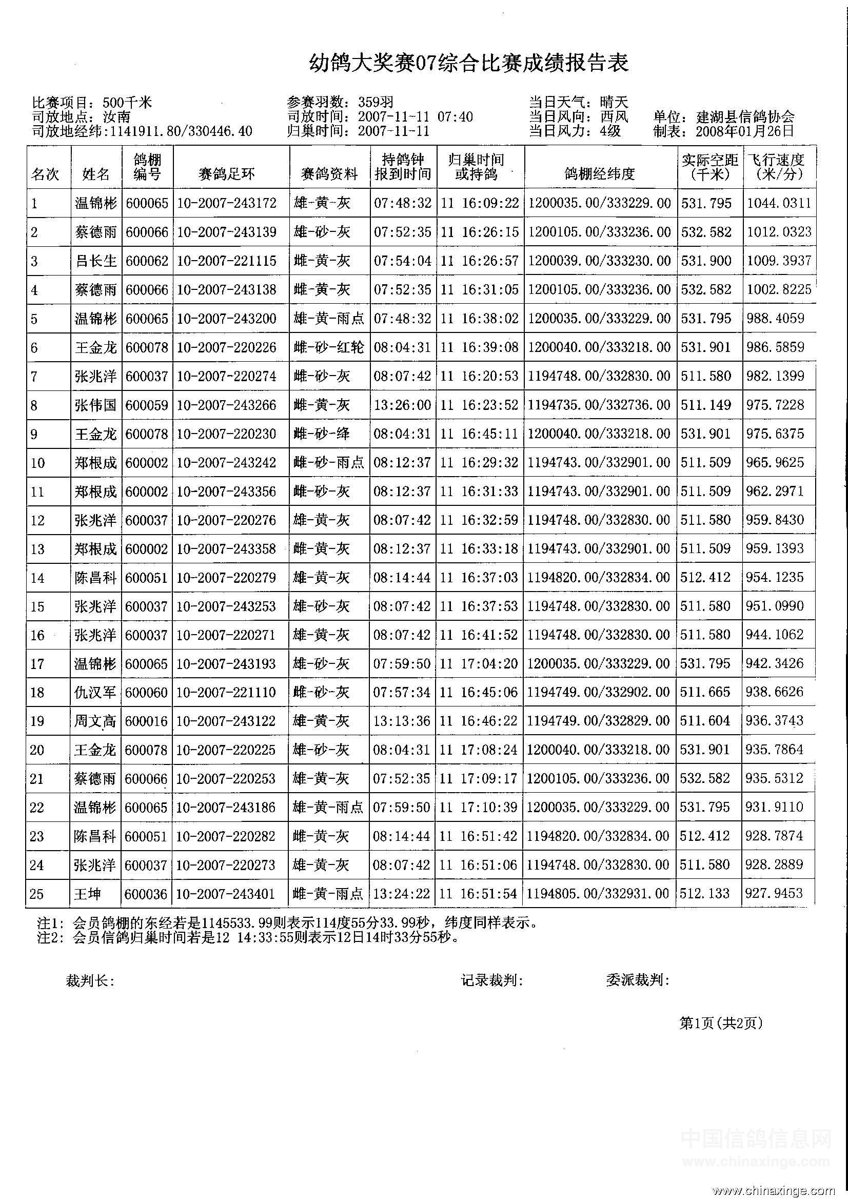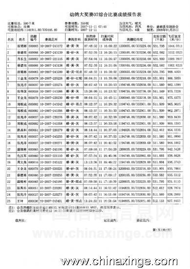建湖鸽协幼鸽大奖赛07综合比赛成绩表(一)
