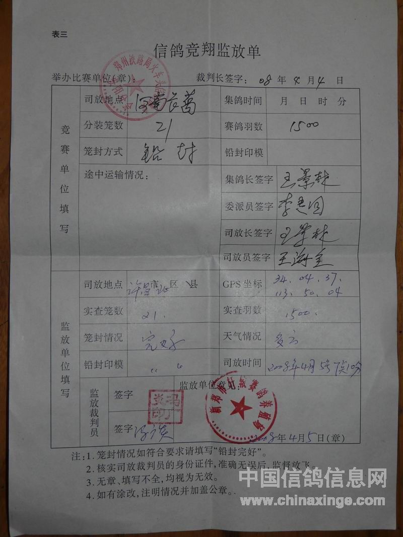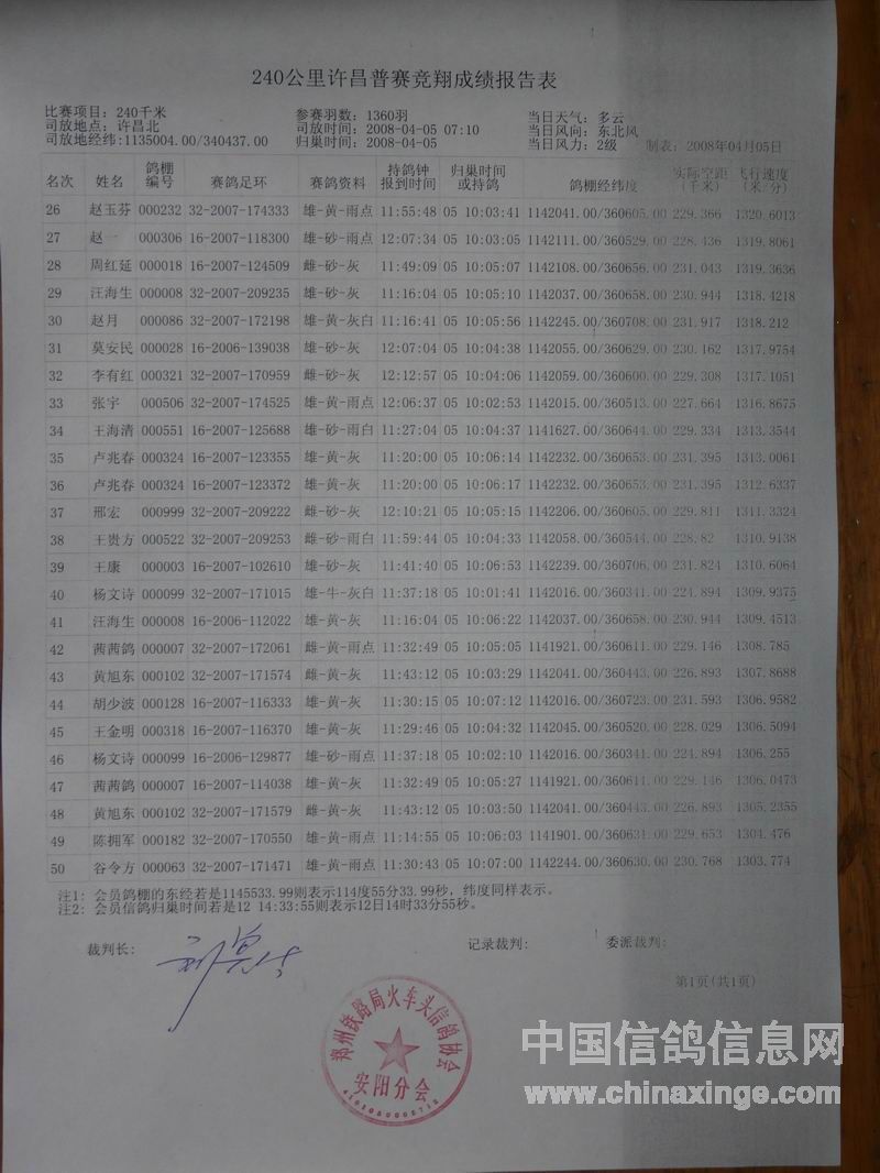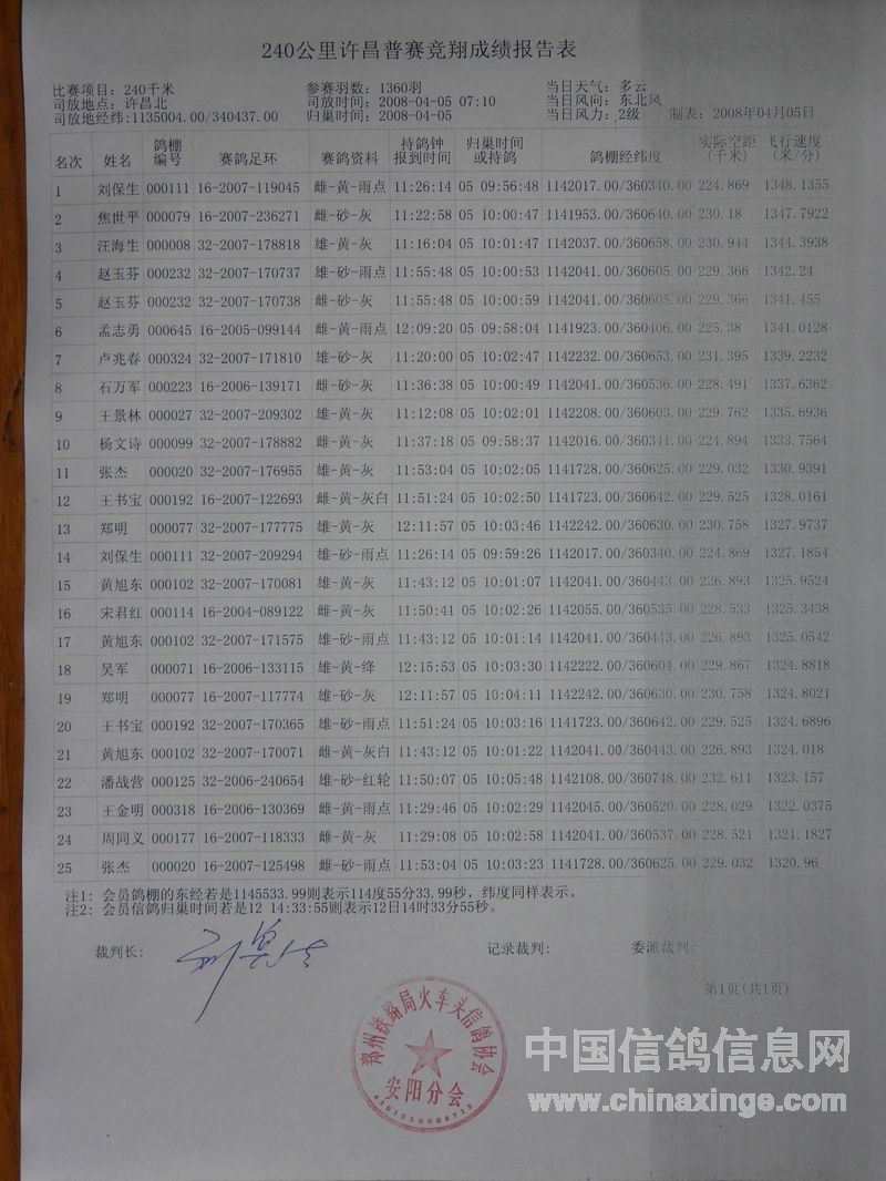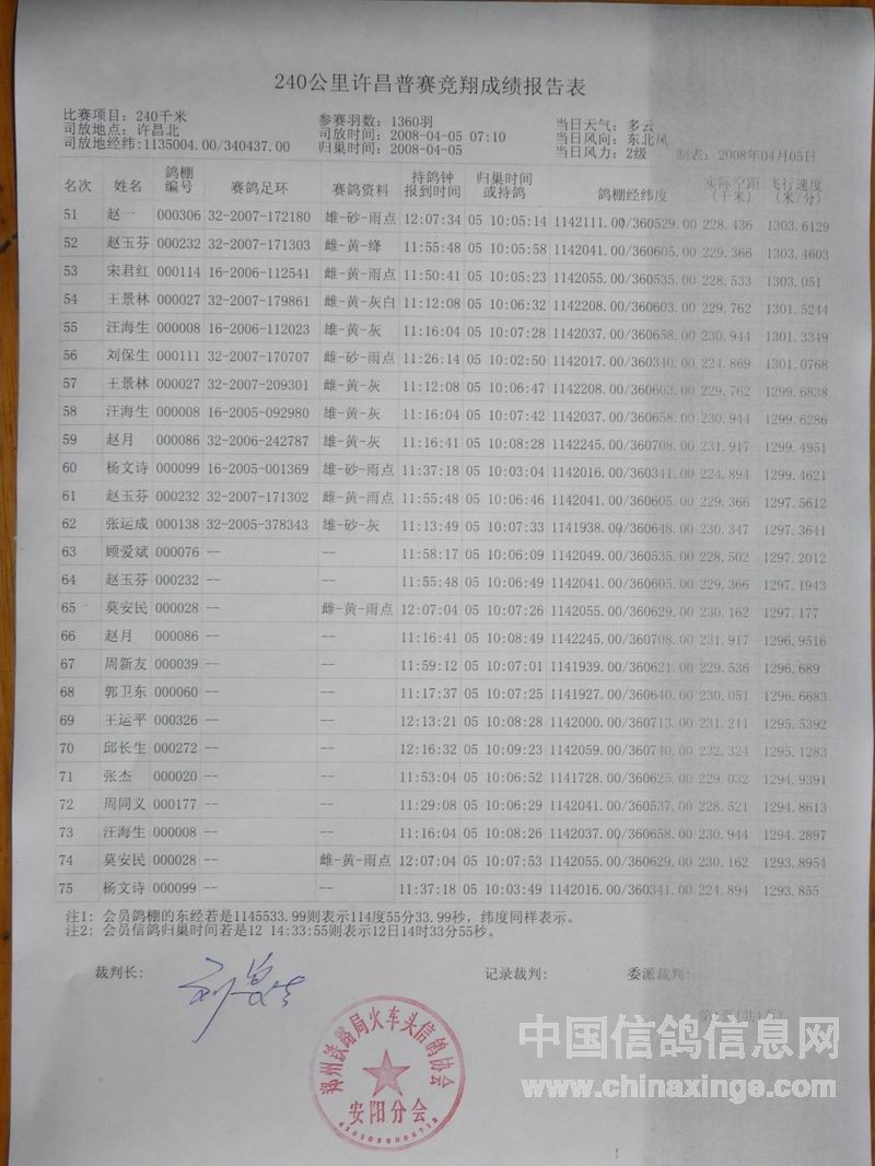 安阳铁路信鸽协会08年4月5日240公里普赛成绩单