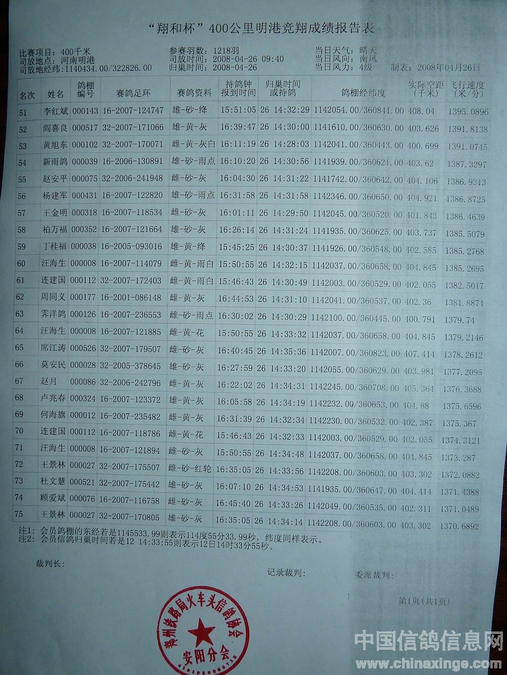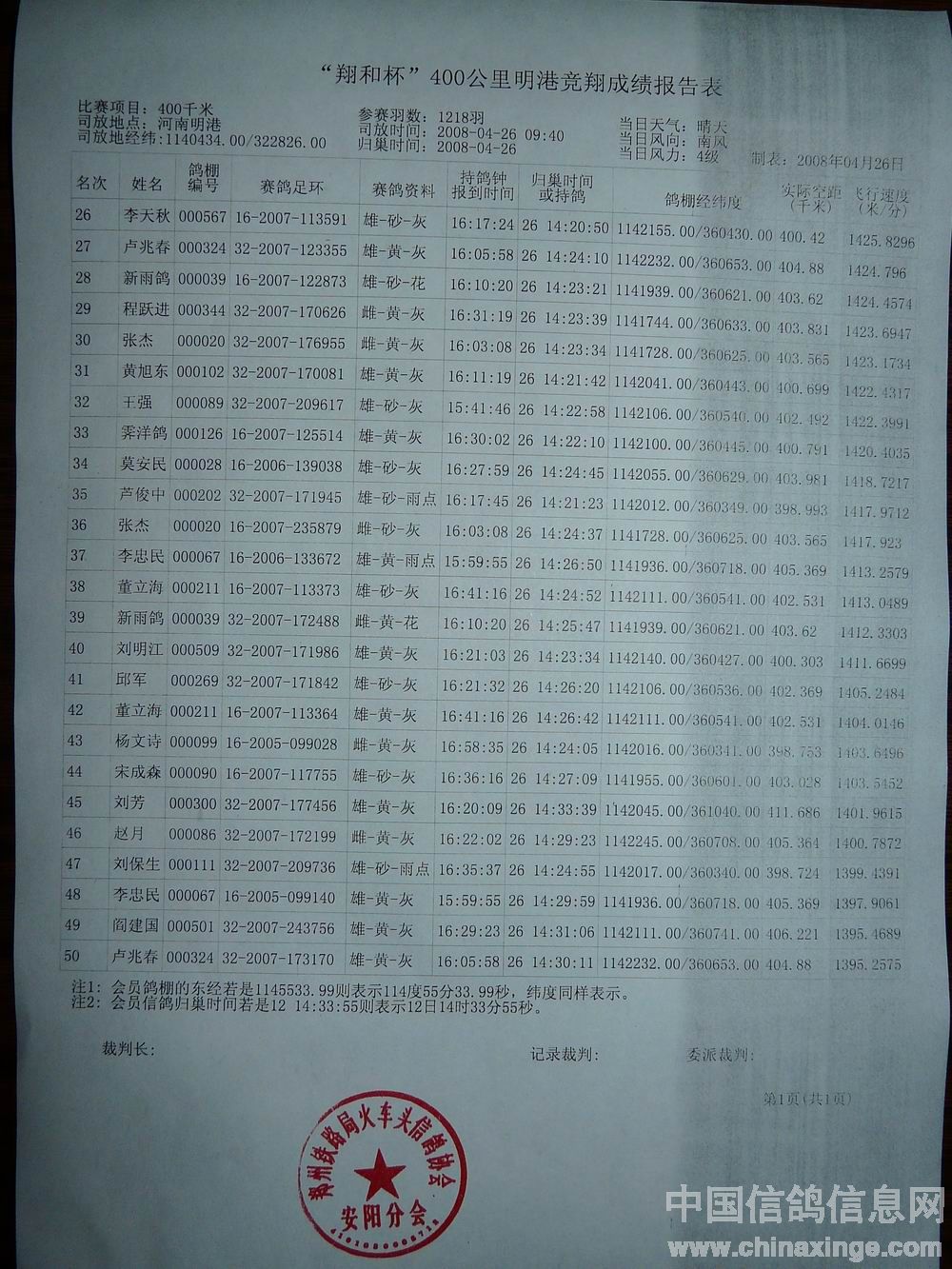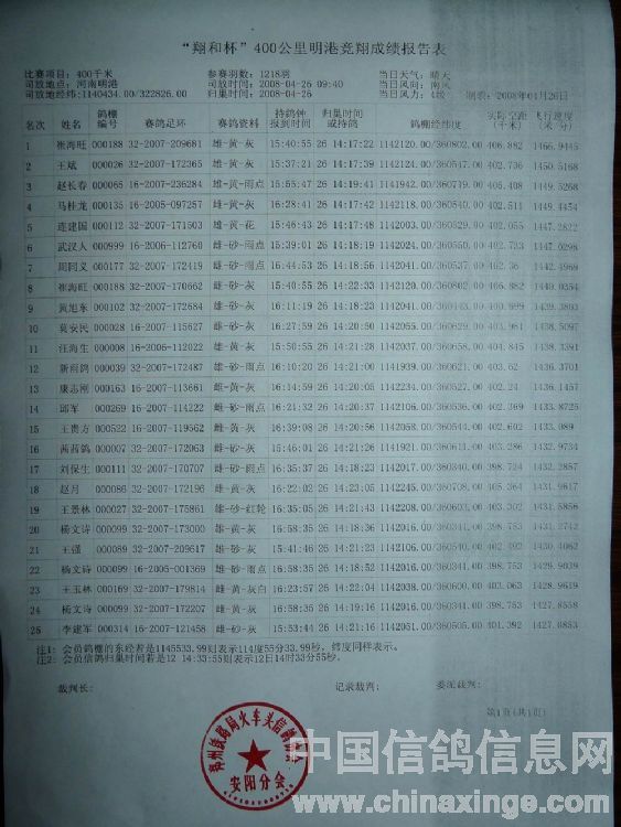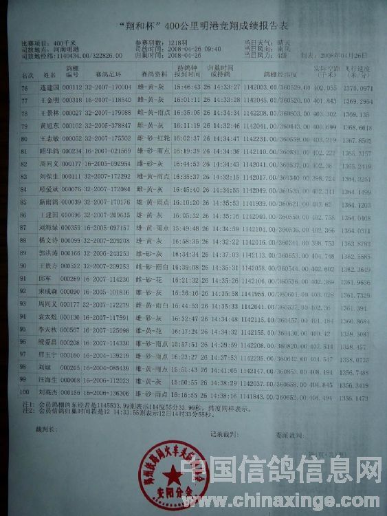 安阳铁路鸽协"翔和杯"400公里成绩单