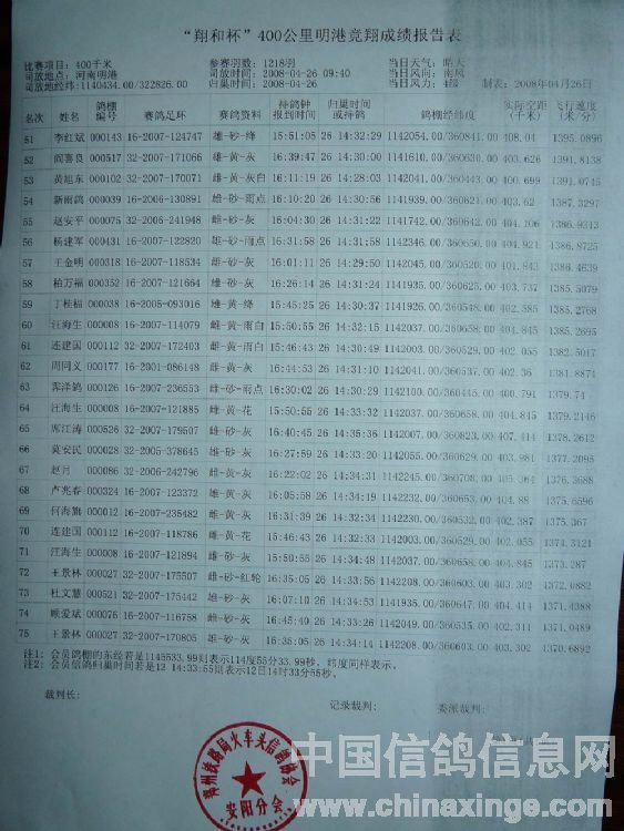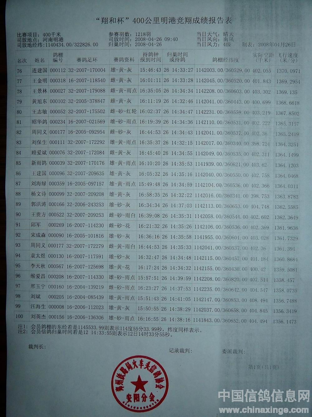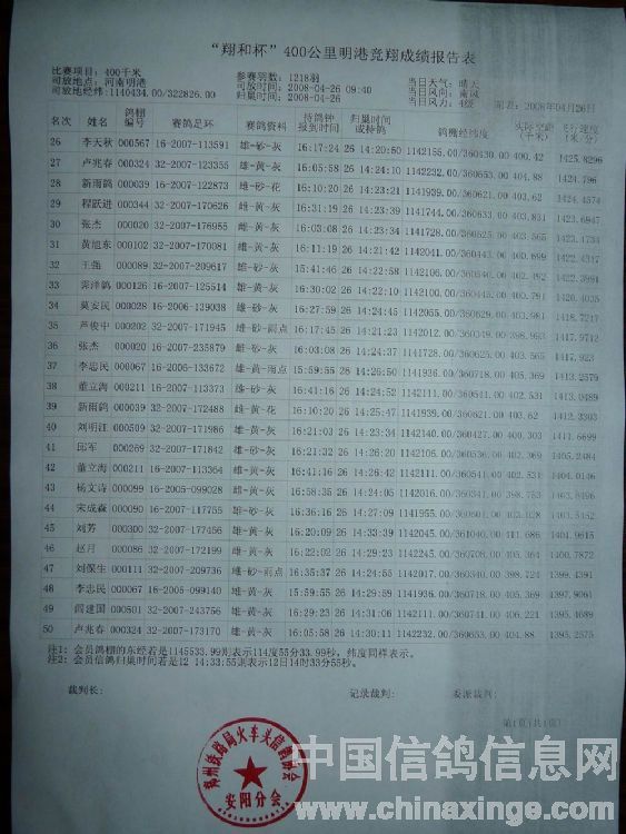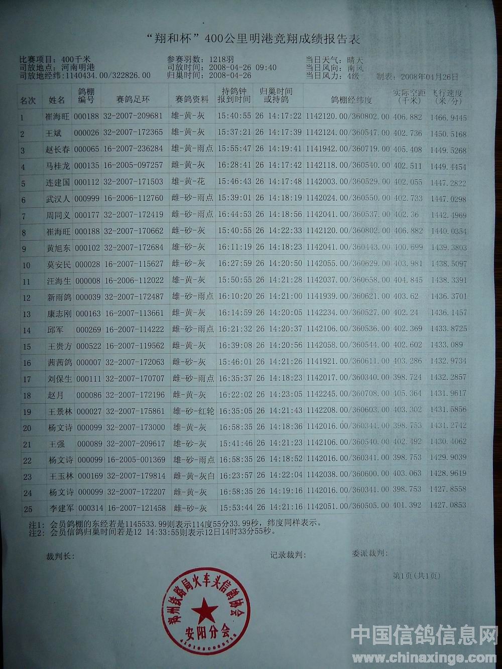安阳铁路鸽协"翔和杯"400公里成绩单