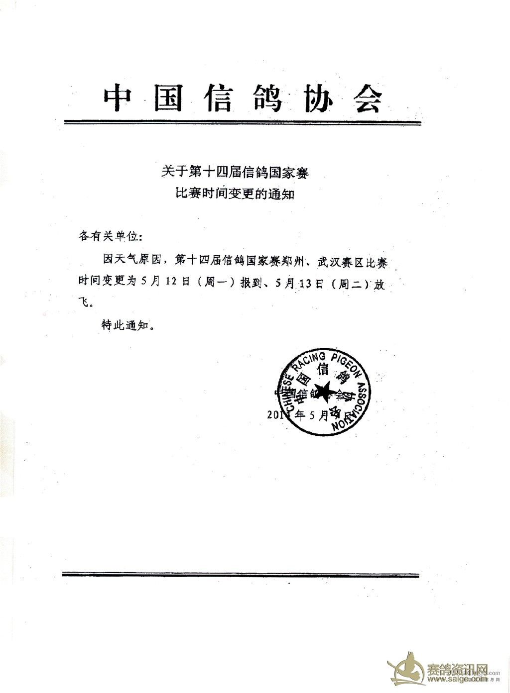 关于第十四届信鸽国家赛比赛时间变更的通知