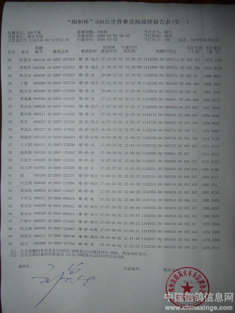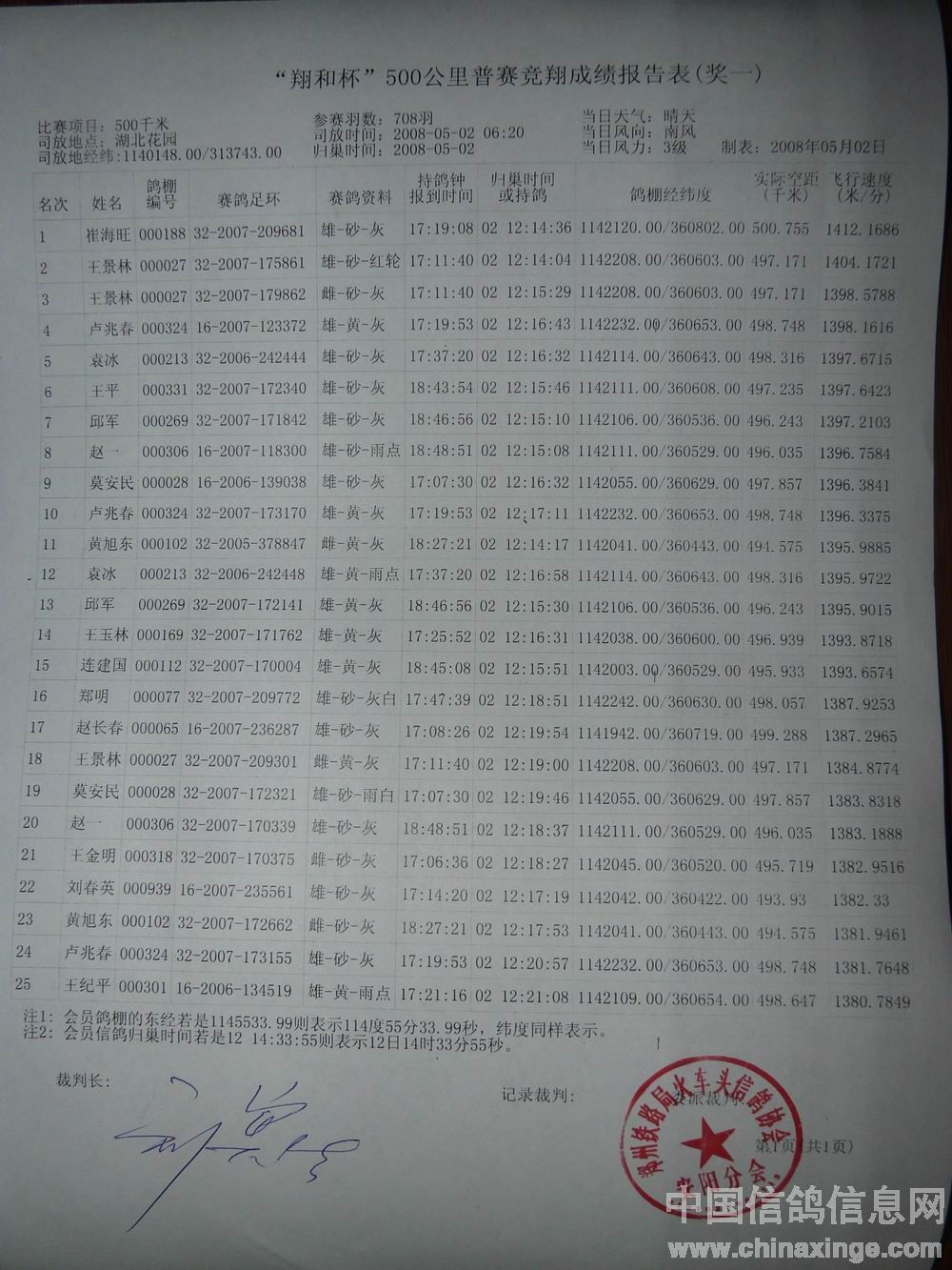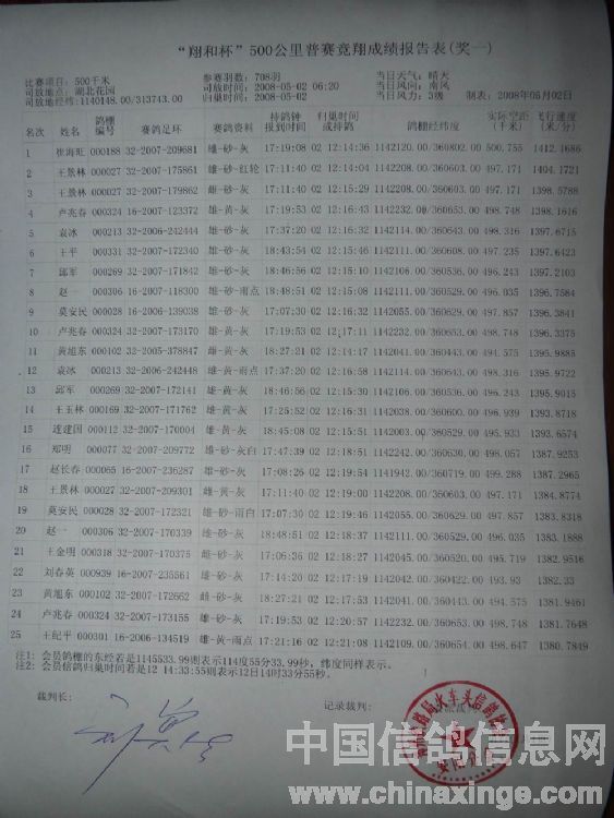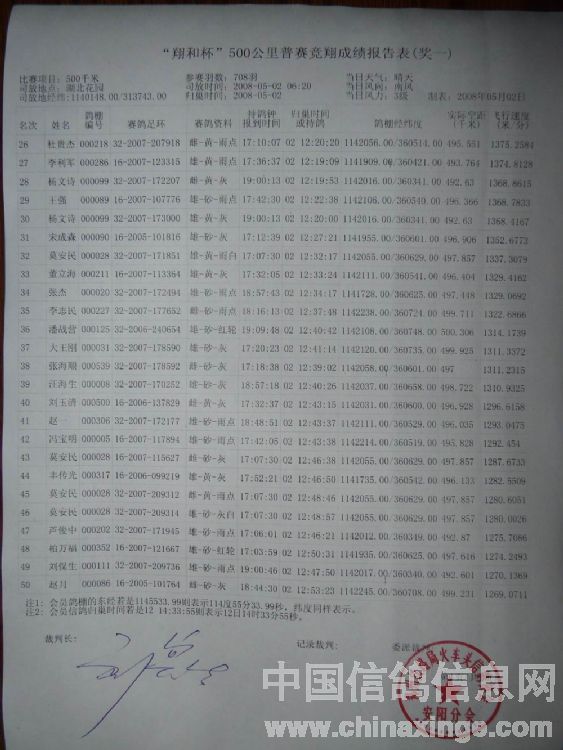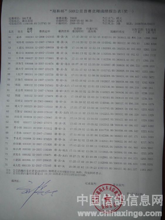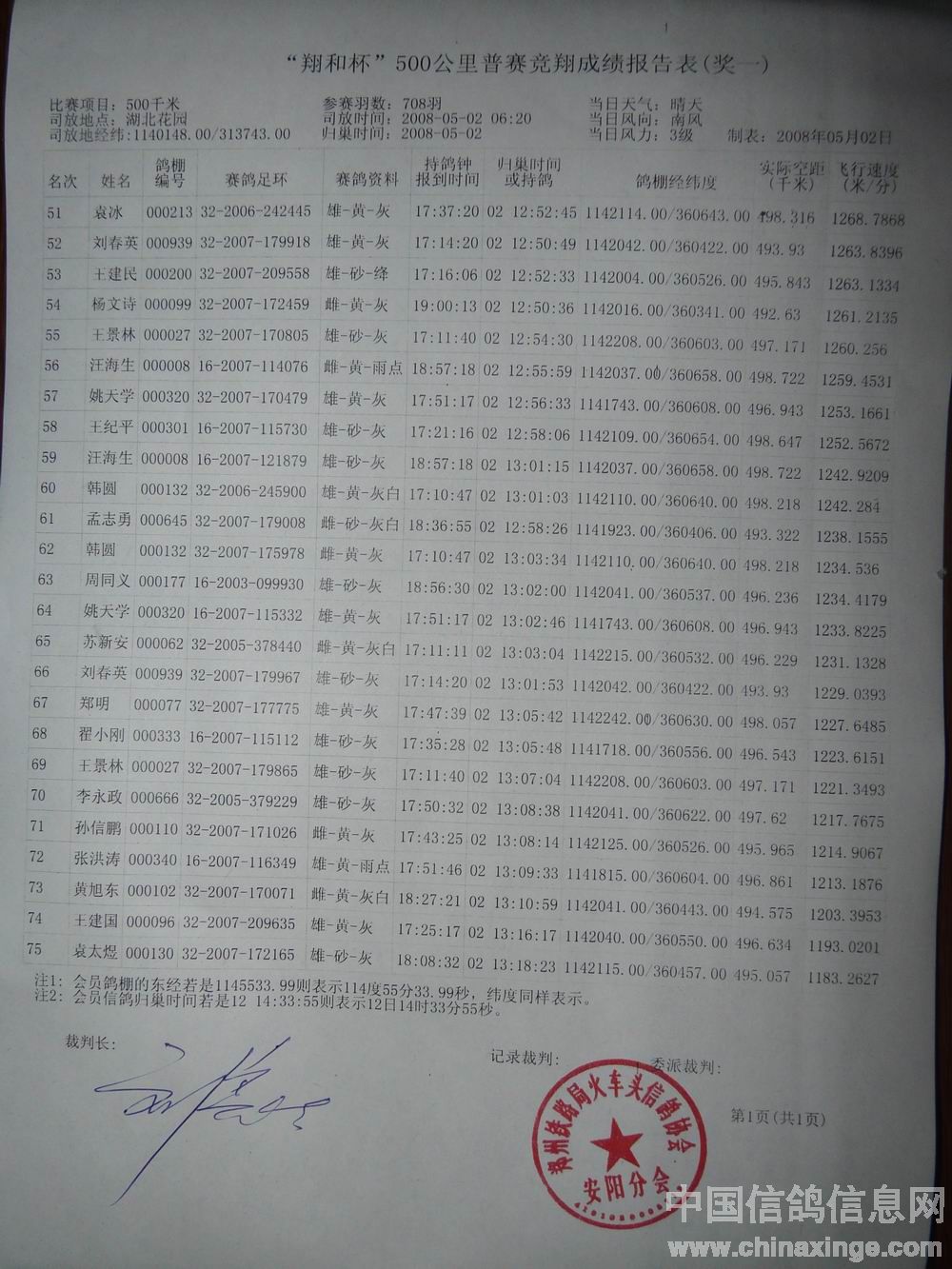 安阳铁路鸽协500公里"翔和杯"1-75名成绩单