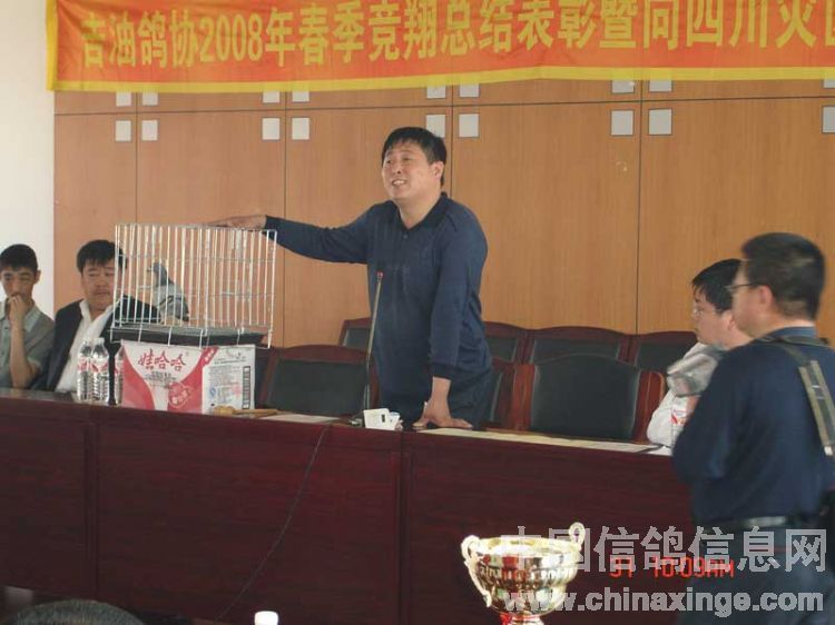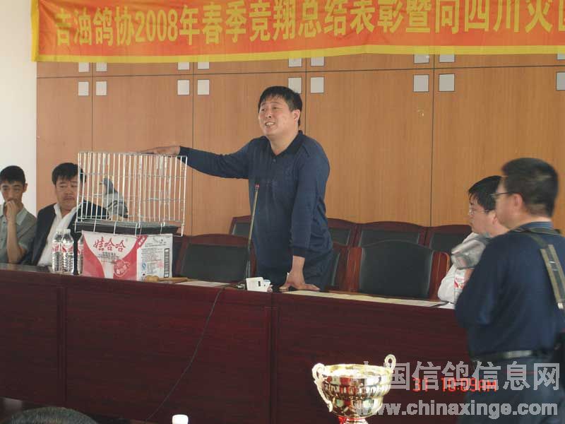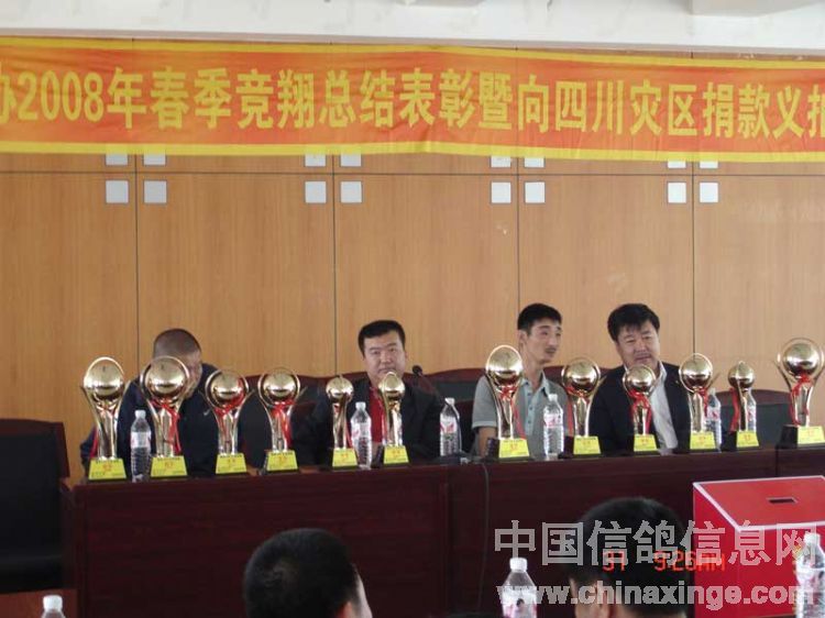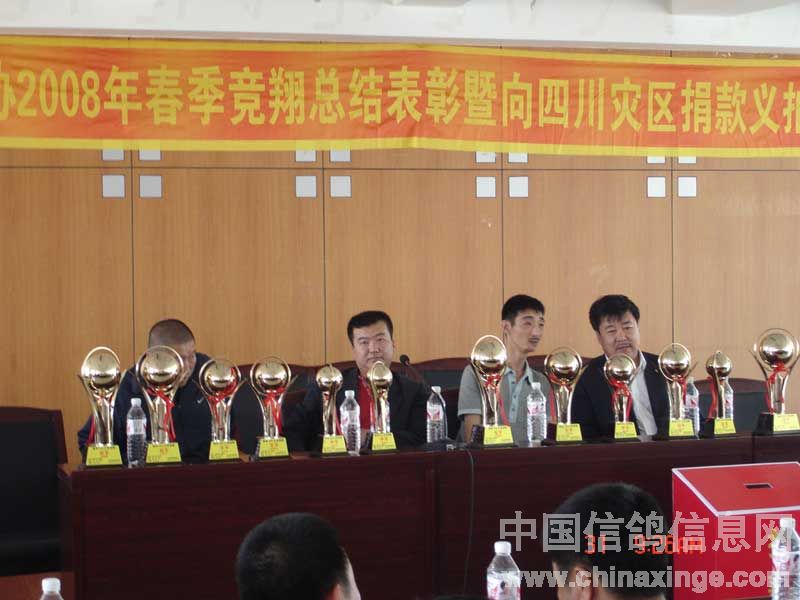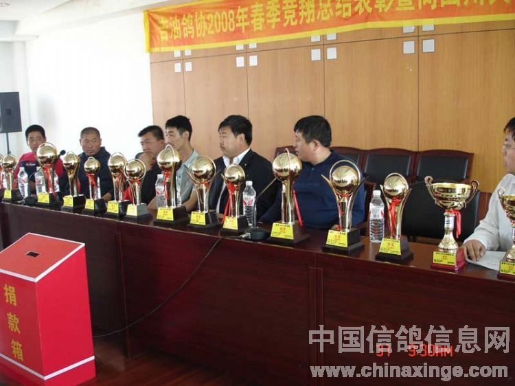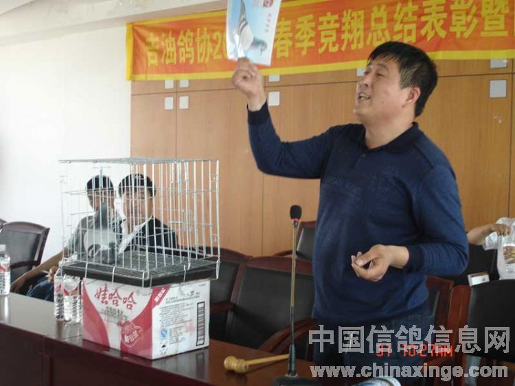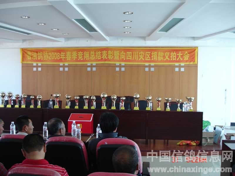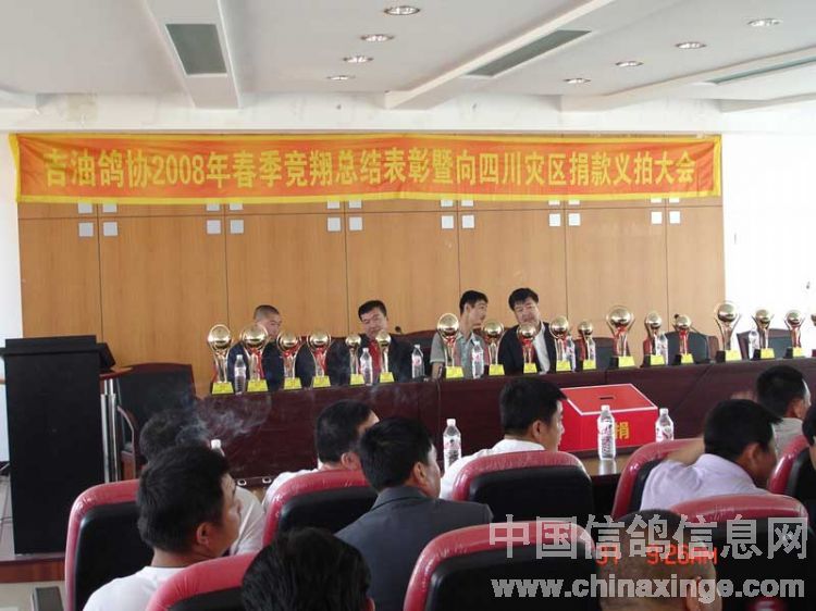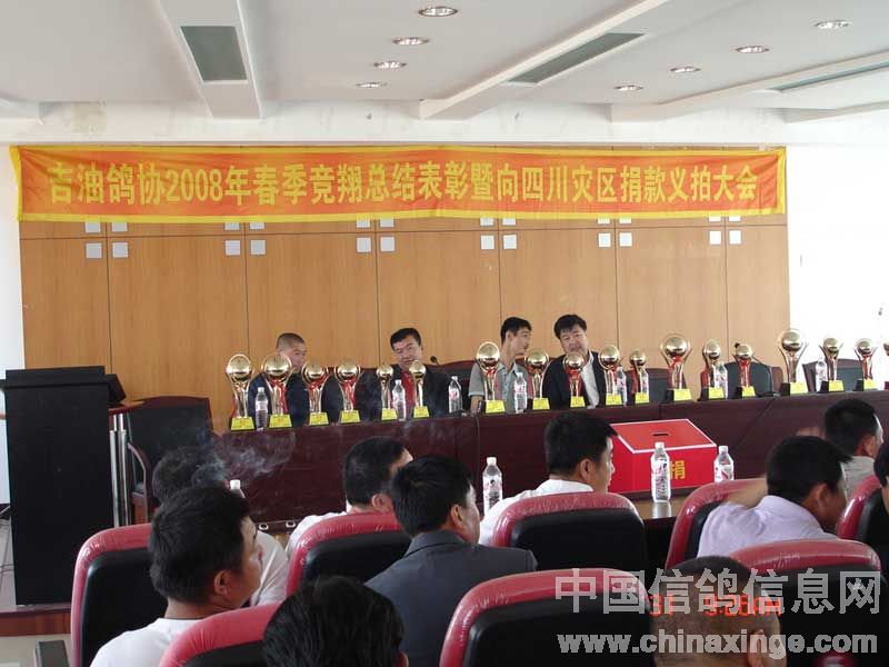 吉林油田鸽会2008年春季竞翔表彰暨"情系灾区"义拍会与5月31日上午9:00在吉林省松原市日报社六楼会议室隆重举行。此次义拍会共接到来自辽宁省、黑龙江省、吉林省21个优胜鸽舍33羽优秀赛鸽、种鸽和原环种鸽,除此之外,还得到沈阳市马氏药业的大力支持(10套赛鸽竞翔专用药品)。拍卖会得到了社会各界及广大鸽友的重视和大力支持,除吉油鸽会会员参加外,四平浩展公棚总经理牛广武先生、吉油石油大厦小宾馆书记袁彬先生及松原市长岭县、扶余县、乾安县等协会的领导参加了会议,松原日报社为此次义拍会提供了场地并进行了报道。此次义拍会共拍得善款12,100.00元(壹万贰仟壹佰元整),虽筹得的善款不多但充分体现吉林石油赛鸽人和广大信鸽爱好者,情系灾区愿为灾区同胞贡献自己一份力量的愿望。在此,对为此次义拍提供优秀赛鸽的鸽友及积极参加竞拍慷慨解囊鸽友表示衷心的感谢。 捐赠鸽友名单: 飞宇鸽舍(吉林省)1羽拍卖所得150元,杨洪海(吉林省)1羽拍卖所得200元,董伟2羽拍卖所得200元,金帝鸽舍(吉林省)2羽拍卖所得250元,张龙(吉林省)1羽拍卖所得100元,牛广武(吉林四平)3羽拍卖所得1600元,顾氏鸽业(吉林省)2羽拍卖所得700元,潘文胜(黑龙江省大庆)1羽拍卖所得400元,徐连岭(吉林省)4羽拍卖所得400元,佳翔鸽舍(吉林省)2羽拍卖所得1000元,刘旭(辽宁省盘锦赠刘可新)1羽拍卖所得500元,刘可新(吉林省荷兰杨迪汉作育超级种鸽,"唐璜")1羽拍卖所得1100元,华金鸽舍(辽宁省盘锦赠刘可新)1羽拍卖所得200元,赵炎焱(吉林省扶余)1羽拍卖所得300元,崔克越(吉林省)1羽拍卖所得300元,冠庆鸽舍(黑龙江省大庆)1羽拍卖所得100元,冠男鸽业(辽宁省)2羽拍卖所得1750元,金龙鸽业(黑龙江省大庆)1羽拍卖所得200元,梁文君(吉林省)1羽拍卖所得200元,鹏程鸽业(吉林省)2羽拍卖所得1300元,阳光鸽舍(吉林省)1羽拍卖所得100元,赵辉(吉林省)1羽拍卖所得150元。沈阳马氏药业赛鸽专用药10套拍卖所得900元。