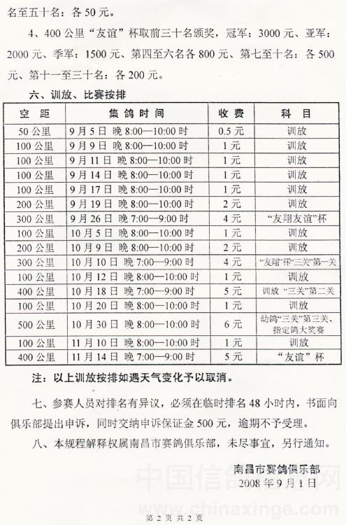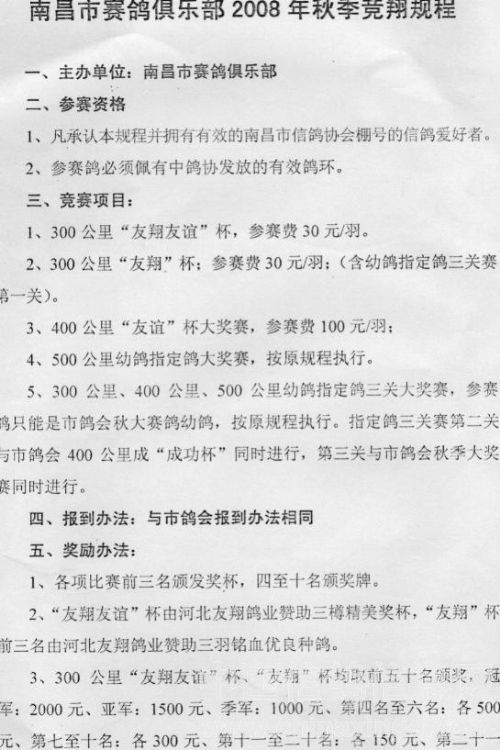 南昌市赛鸽俱乐部2008年秋季竞翔规程