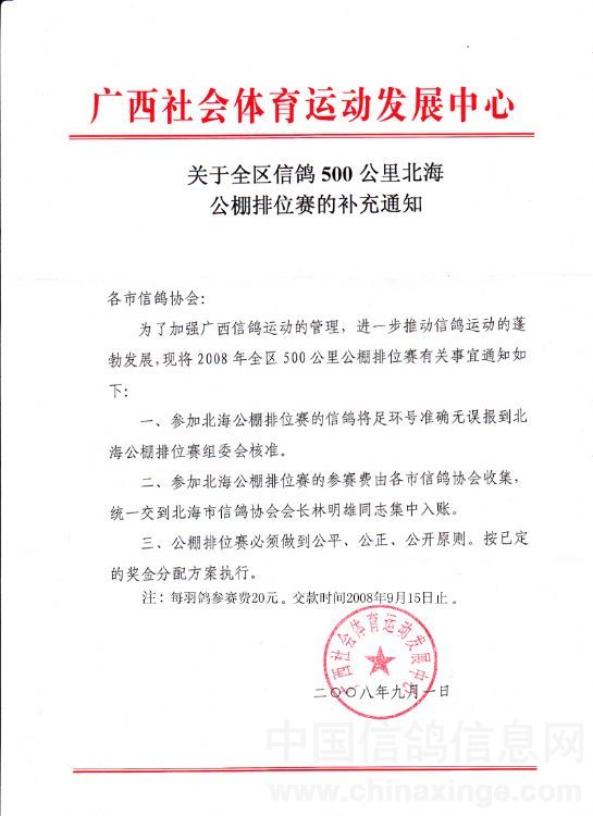 关于全区信鸽500公里北海公棚排位赛的补充通知