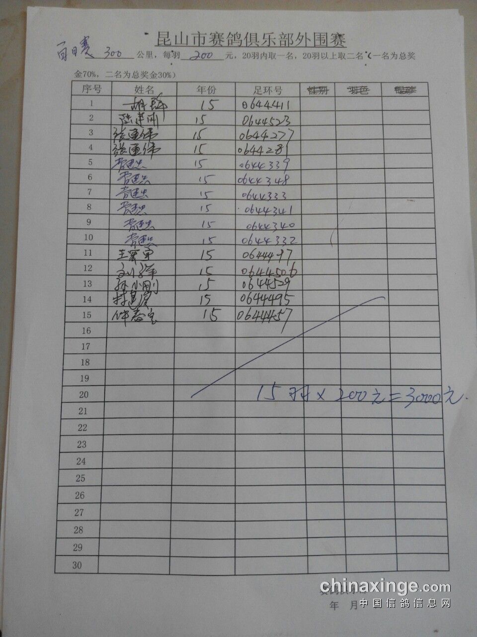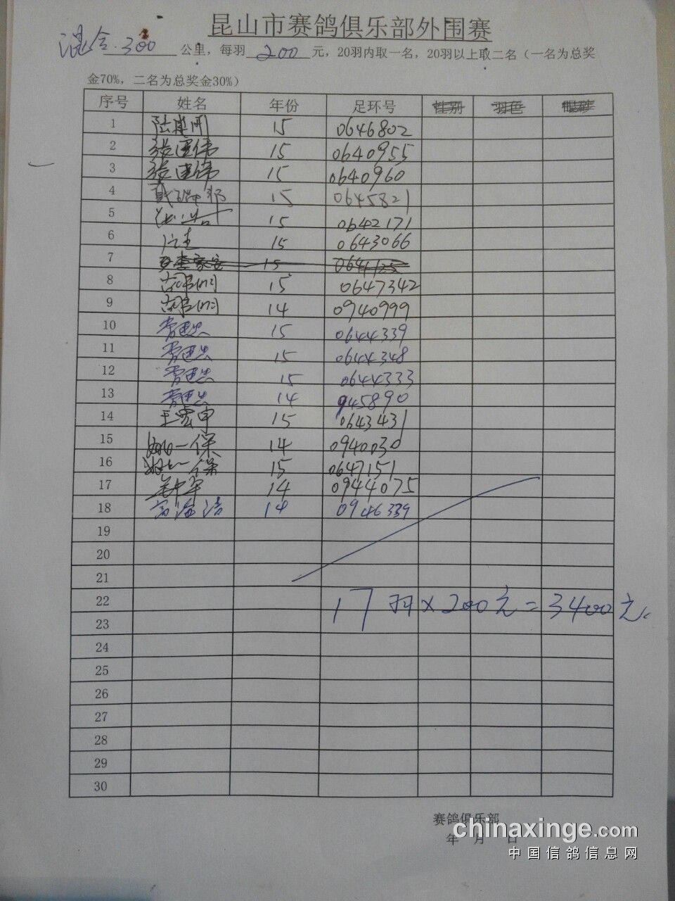集鸽总羽数:2119羽,其中精英赛:478羽,三关赛:508羽,二关赛:504羽,百日赛:164羽。