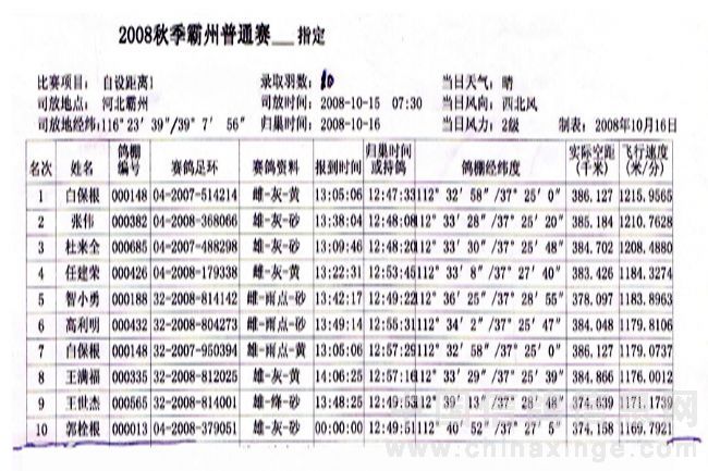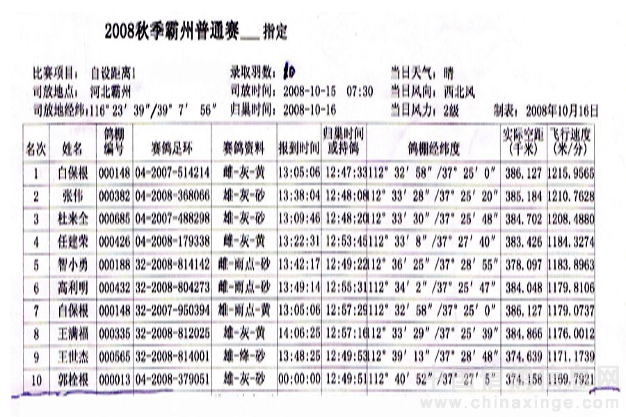 2008年秋400Km霸洲指定赛成绩