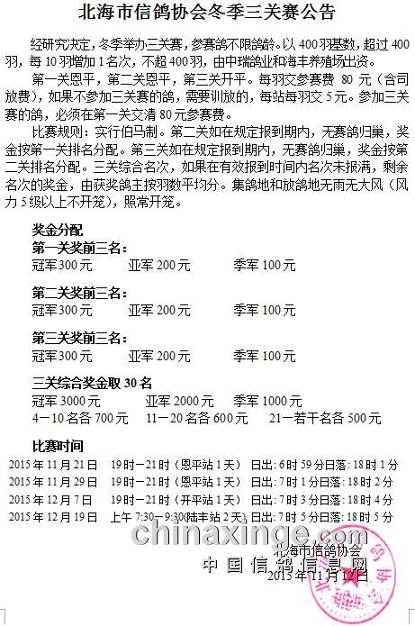 北海市信鸽协会冬季三关赛公告