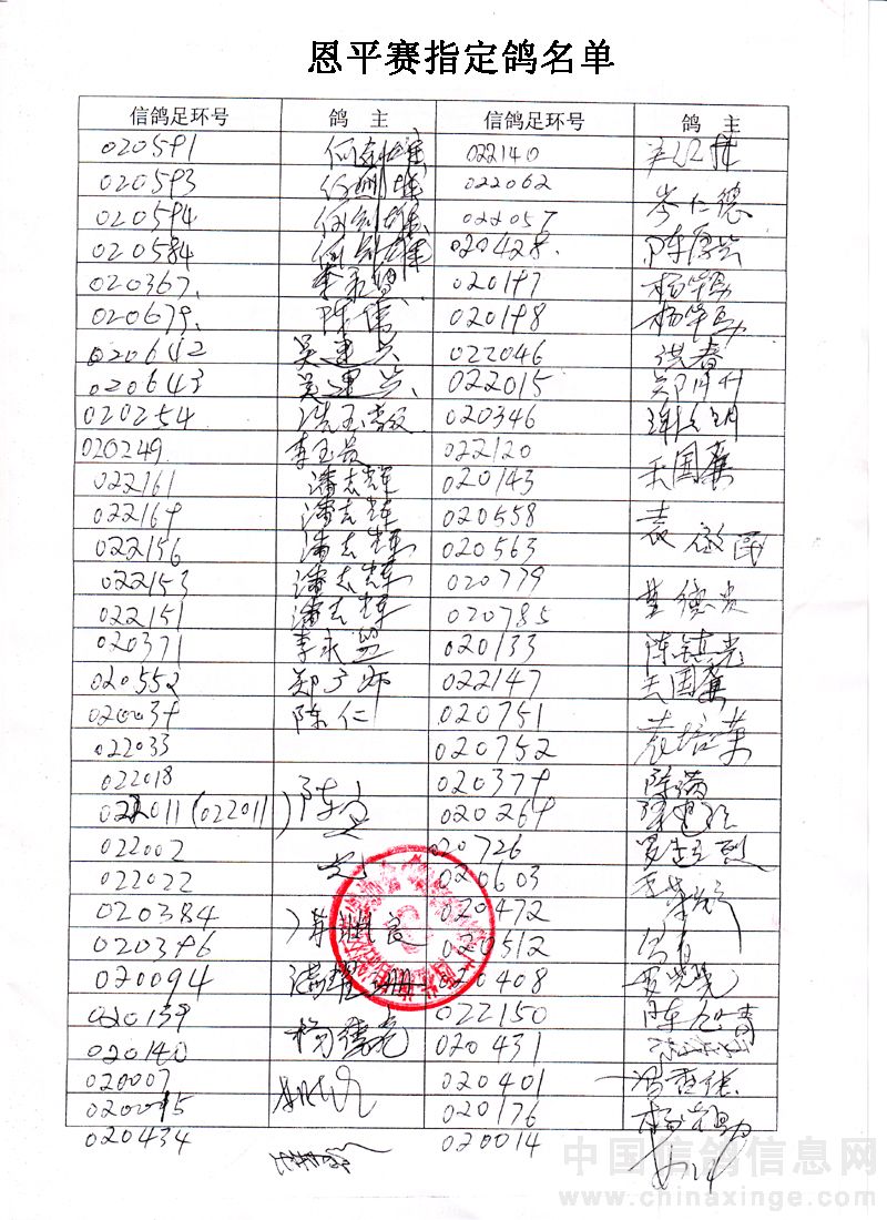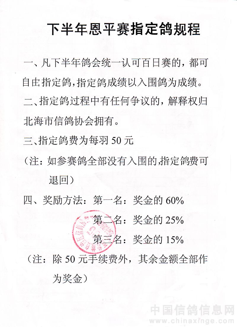 广西北海市信鸽协会恩平赛指定鸽规程与名单