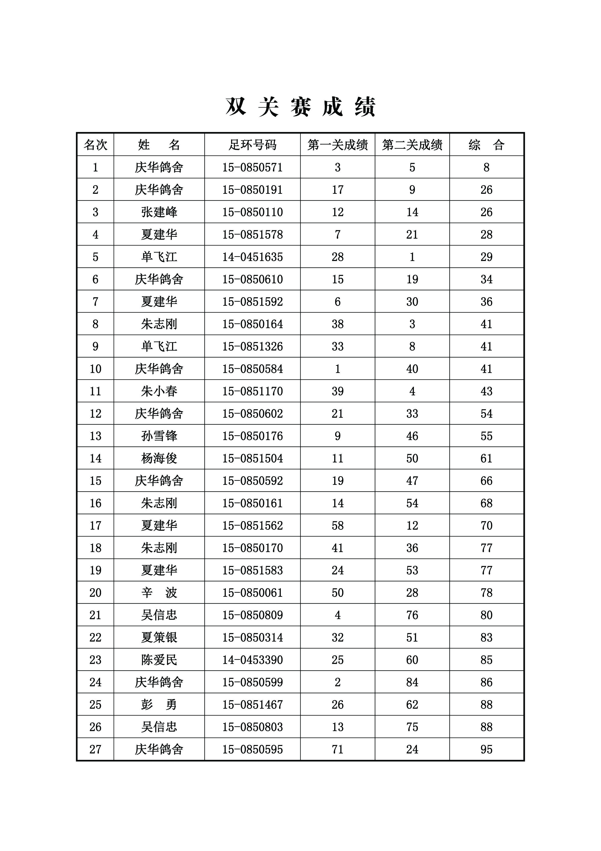 双关赛成绩