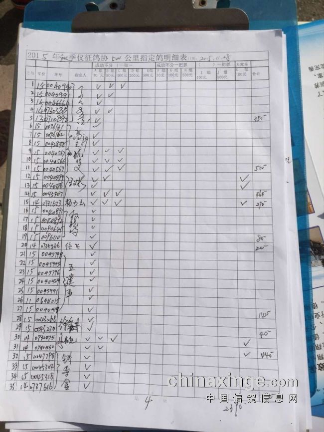 明细:A组20元(11取1)指定鸽246羽,录取23名,1名~22名各奖200.00,23名奖100.00小计4500.00