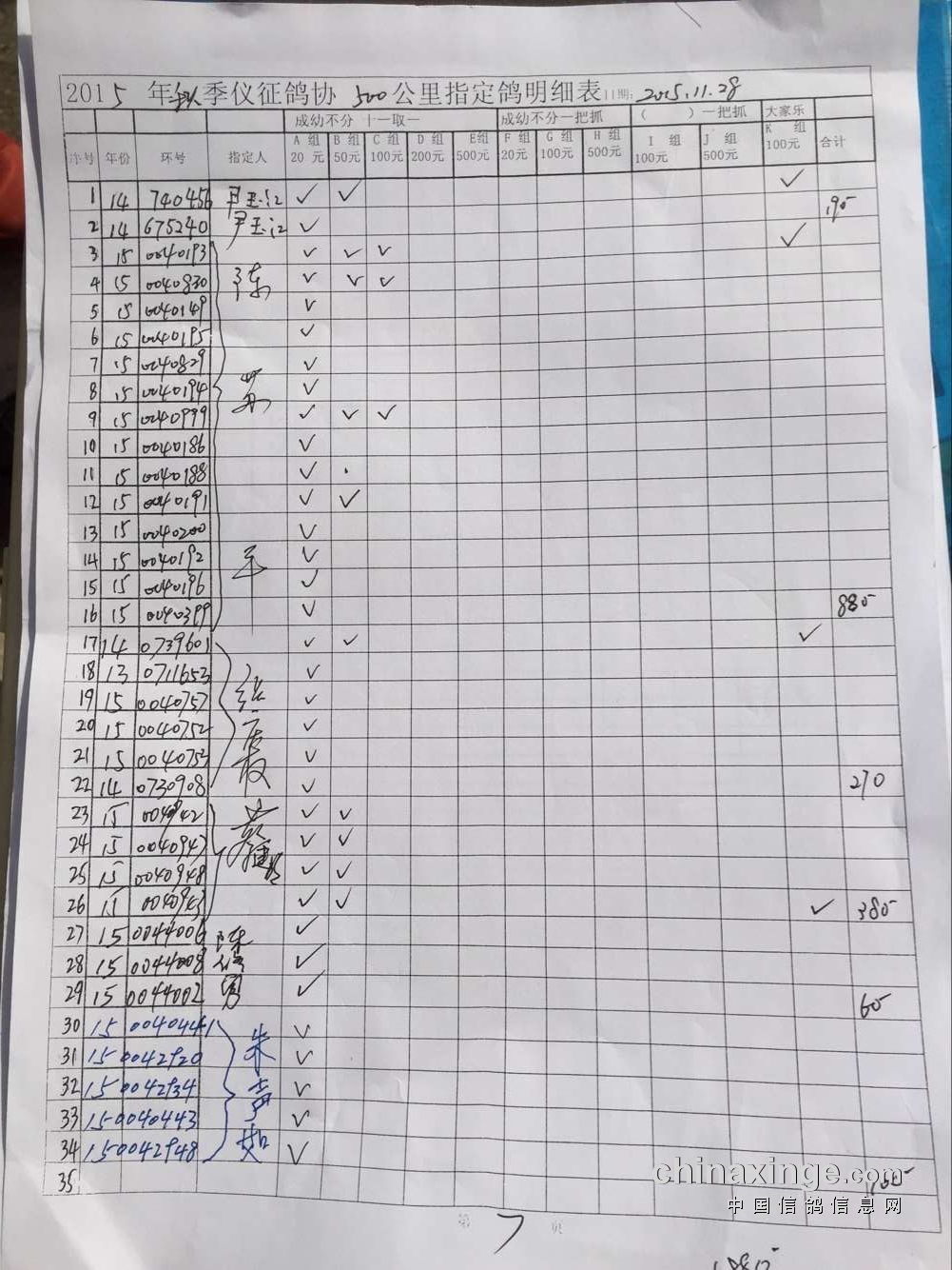 B组50元(11取1)指定鸽77羽,录取7名,1名~7名各奖500.00; 小计3500.00