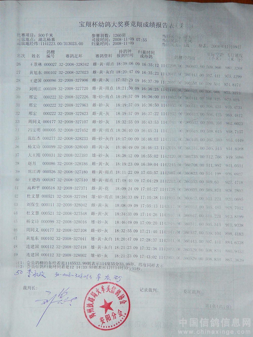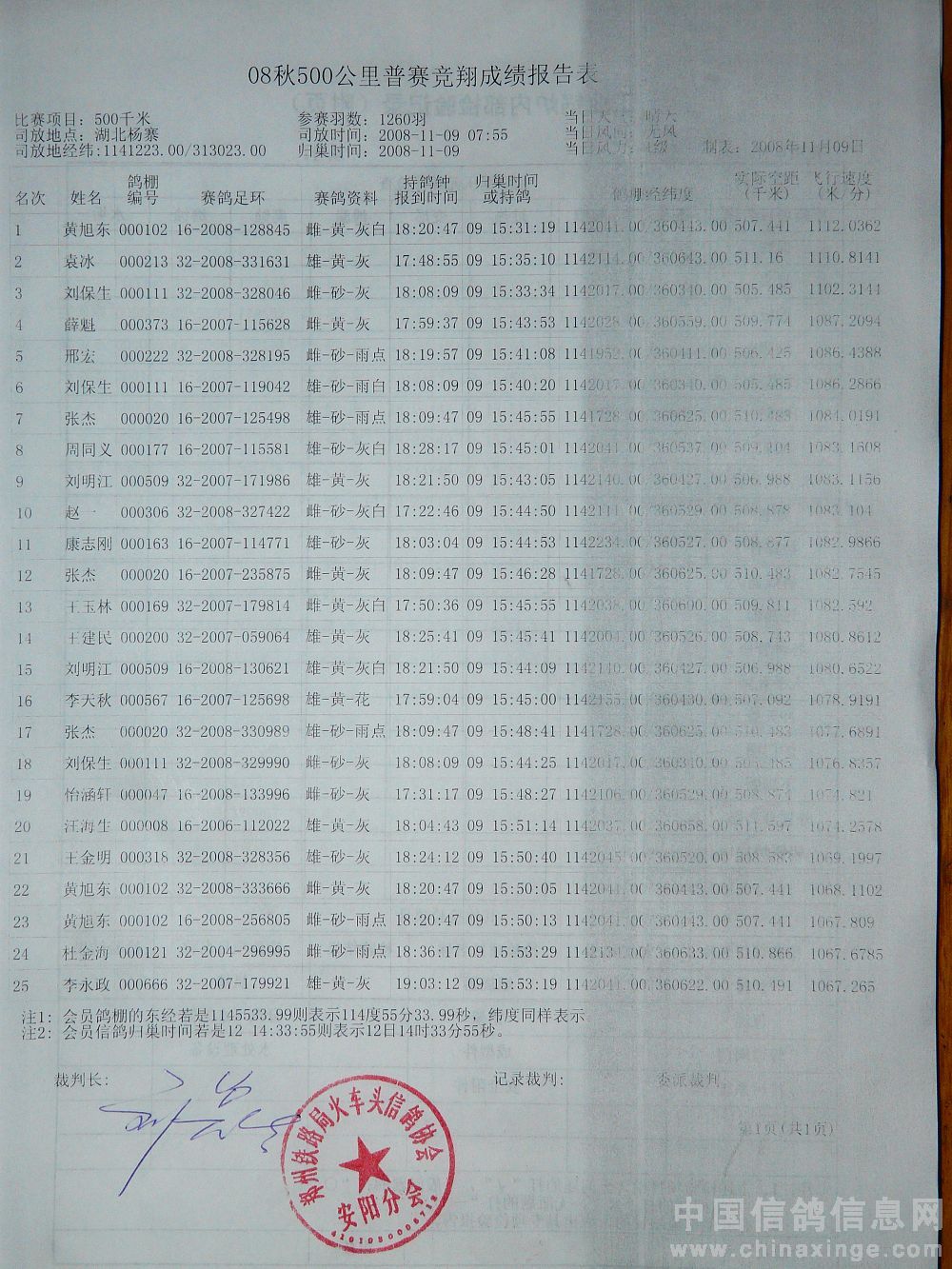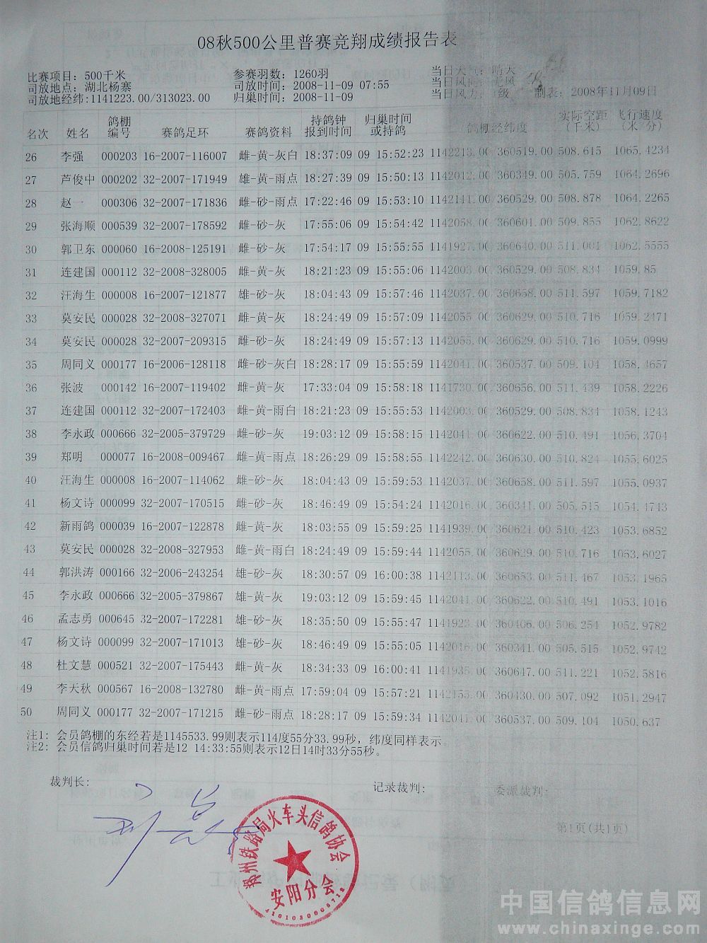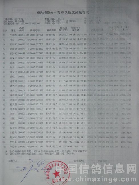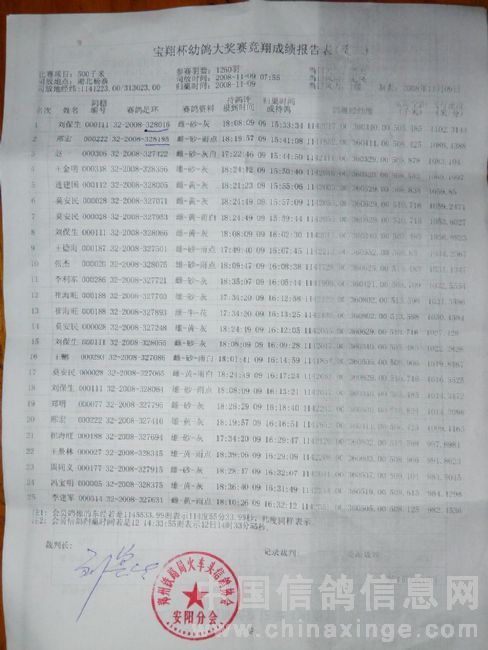 本站比赛实际上笼普赛1260羽(含大奖赛298羽),当日有效报进232羽(含大奖赛50羽),成绩单如下: