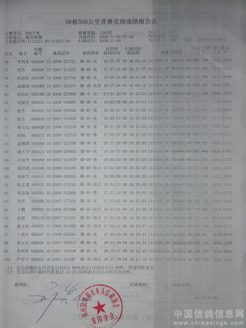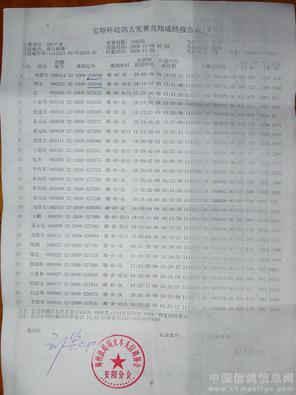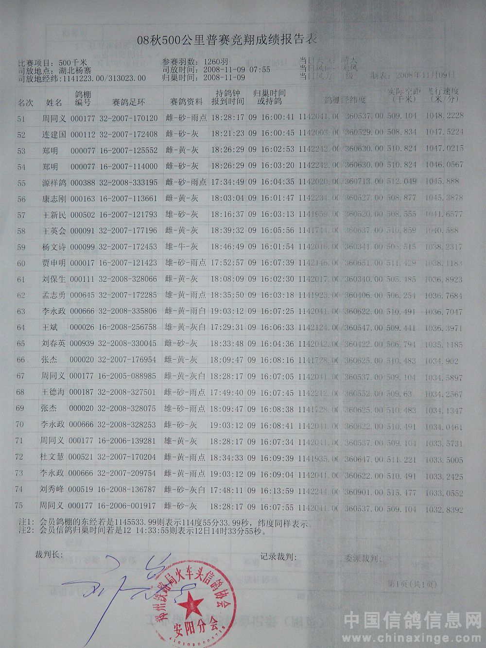 本站比赛实际上笼普赛1260羽(含大奖赛298羽),当日有效报进232羽(含大奖赛50羽),成绩单如下: