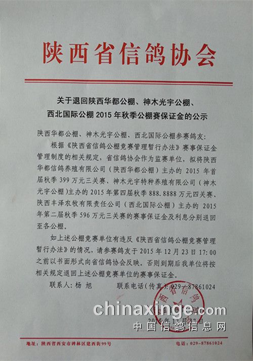 重要通知(关于退回陕西华都公棚、神木光宇公棚、西北国际公棚2015年秋季公棚赛保证金的公示)