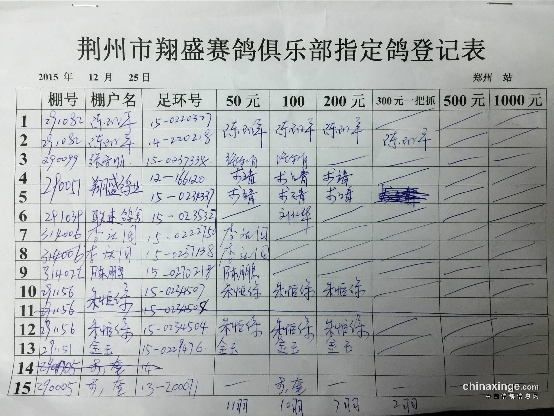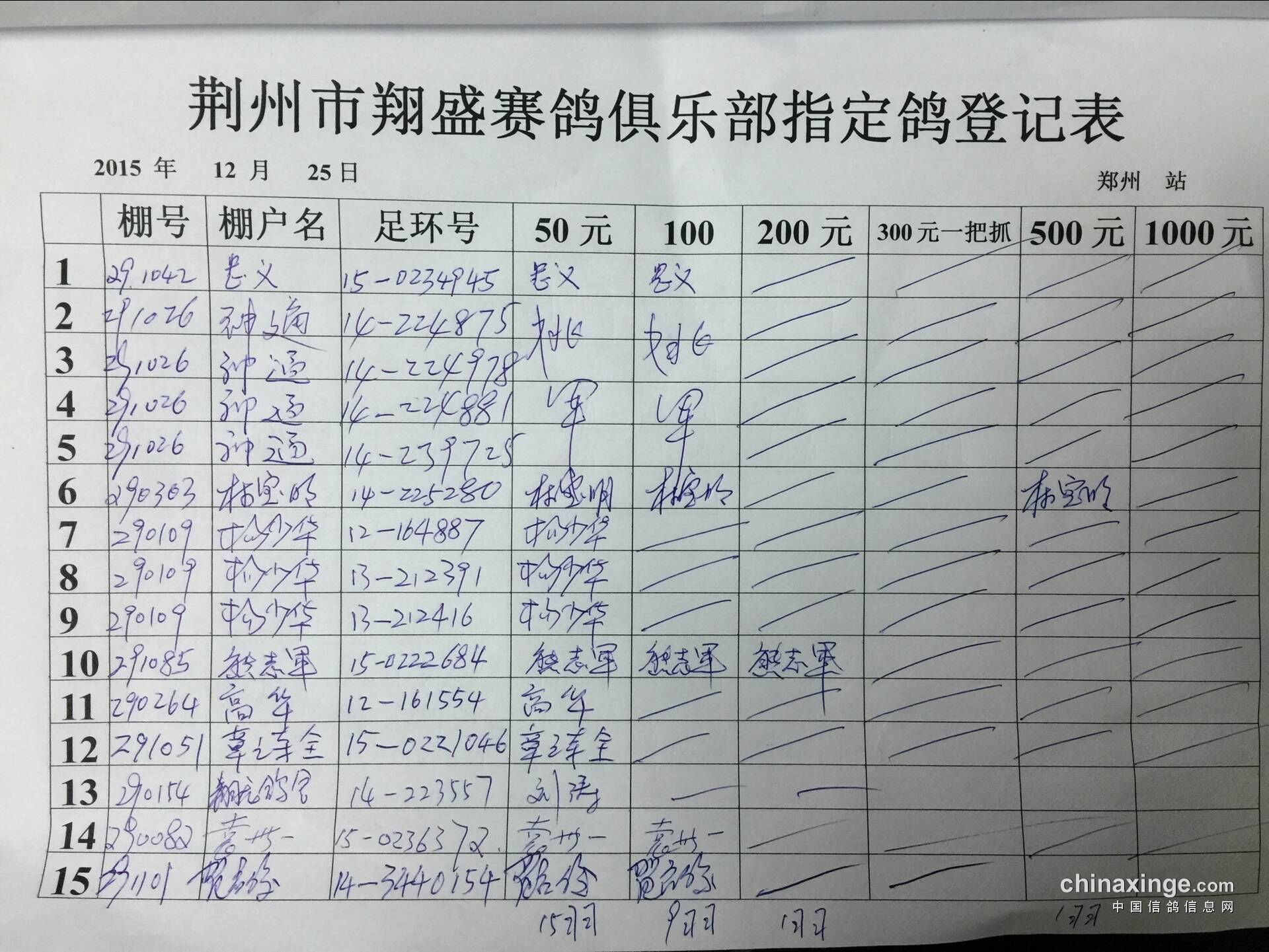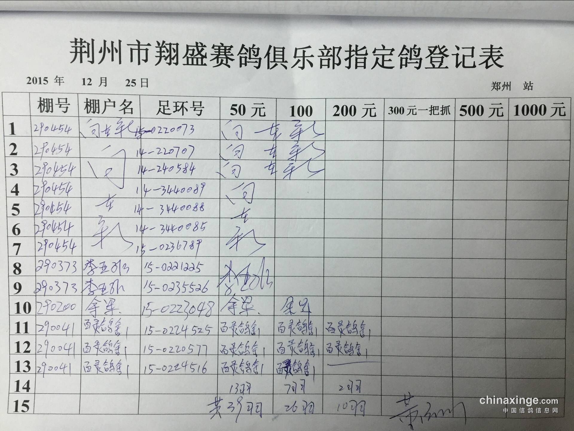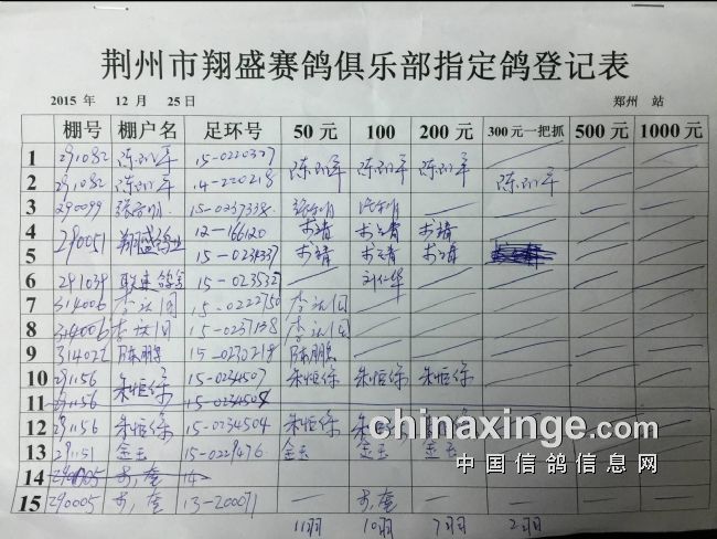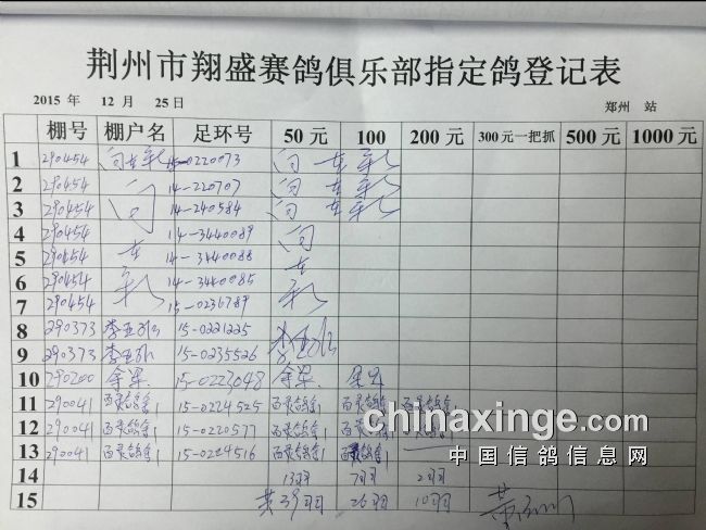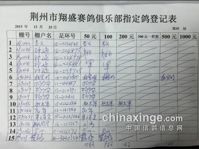 2015年秋12月25日王中王500公里郑州比赛指定鸽明细