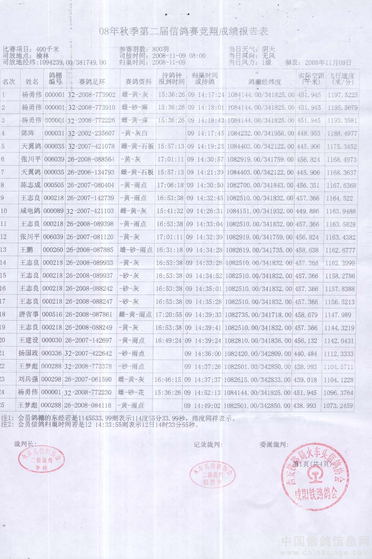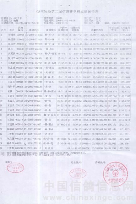 08年秋季第二届信鸽赛竟翔成绩报告表1