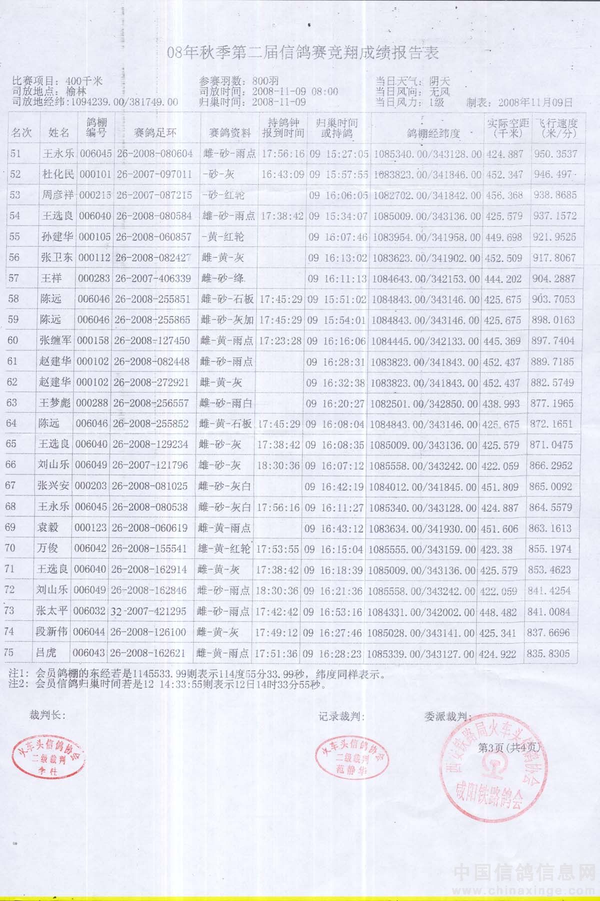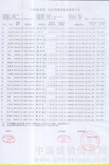 08年秋季第二届信鸽赛竟翔成绩报告表3