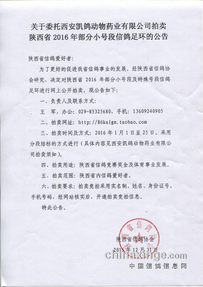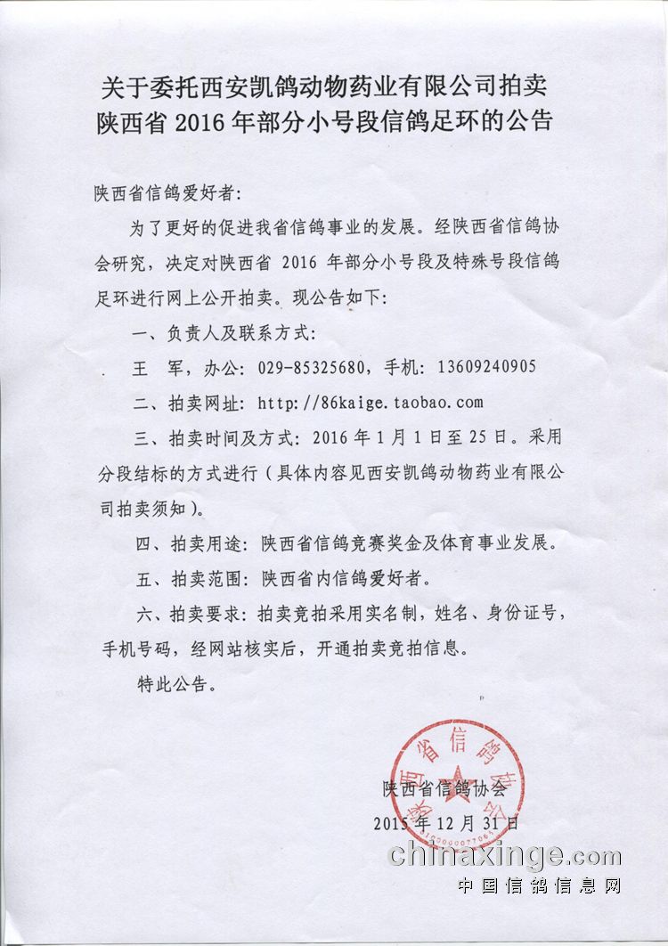 经陕西省信鸽协会研究,决定于2016年陕西省信鸽足环1-1000号段、一组10枚豹子号(1111、2222、3333、4444、5555、6666、7777、8888、9999、10000)向全省信鸽爱好者公开拍卖,信鸽足环拍卖正式上线,拍卖所得款全部用于省信鸽竞赛奖金。