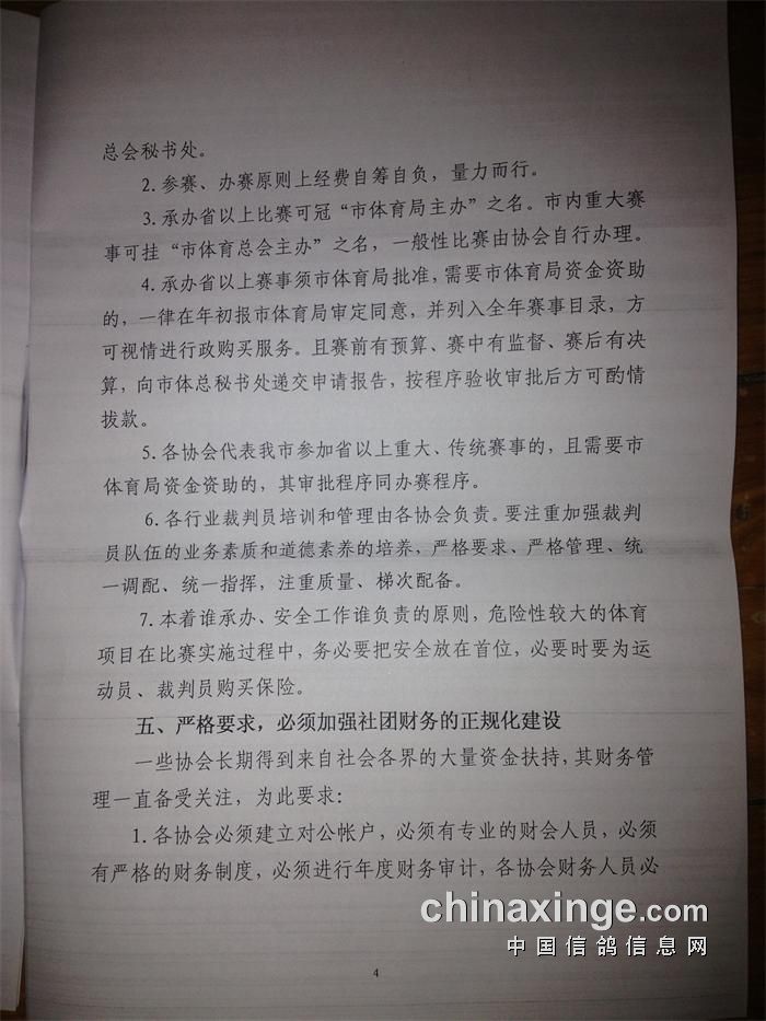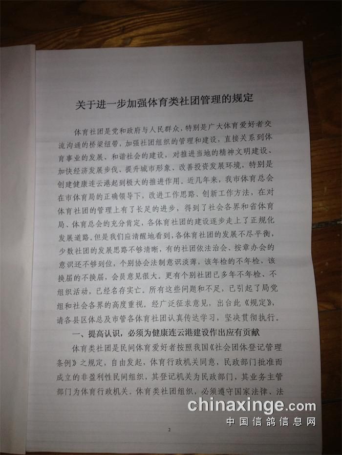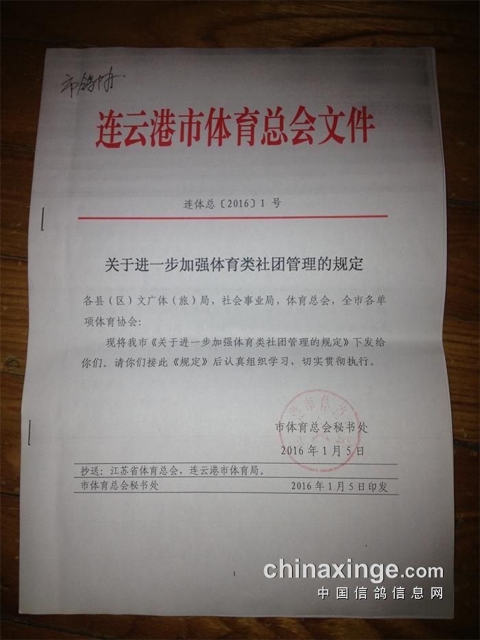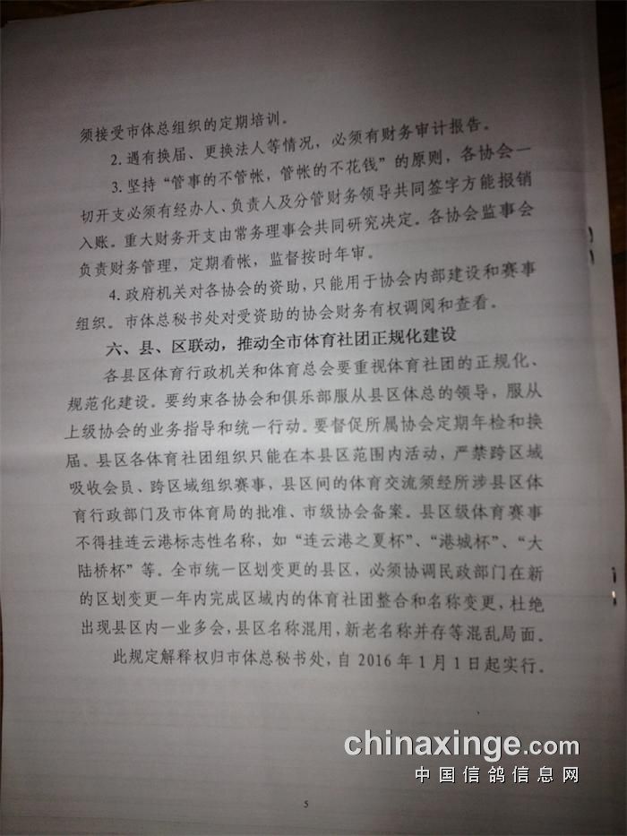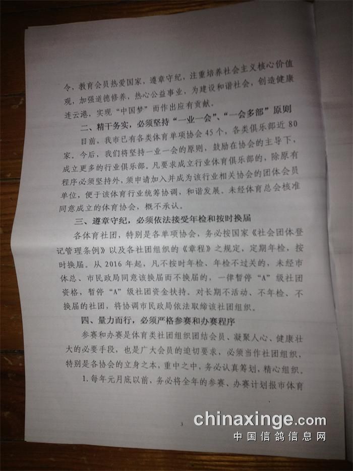 在今天下午于体育局召开的连云港市体育社团工作会议上,连云港市体育总会出台了以下文件,希望各单位认真组织学习、贯彻执行,并以此文件为管理依据,从而提高管理水平,促进协会科学发展。