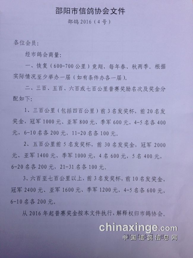 邵阳市信鸽协会文件 [邵鸽2016-4号]