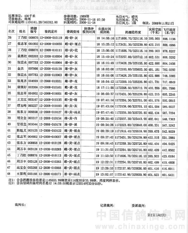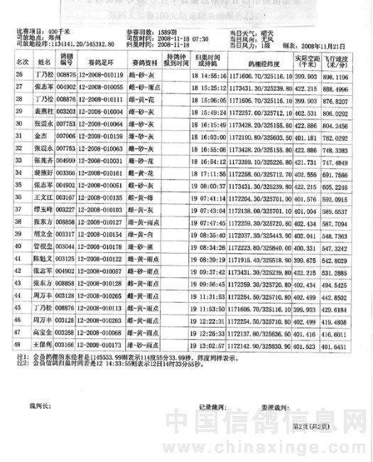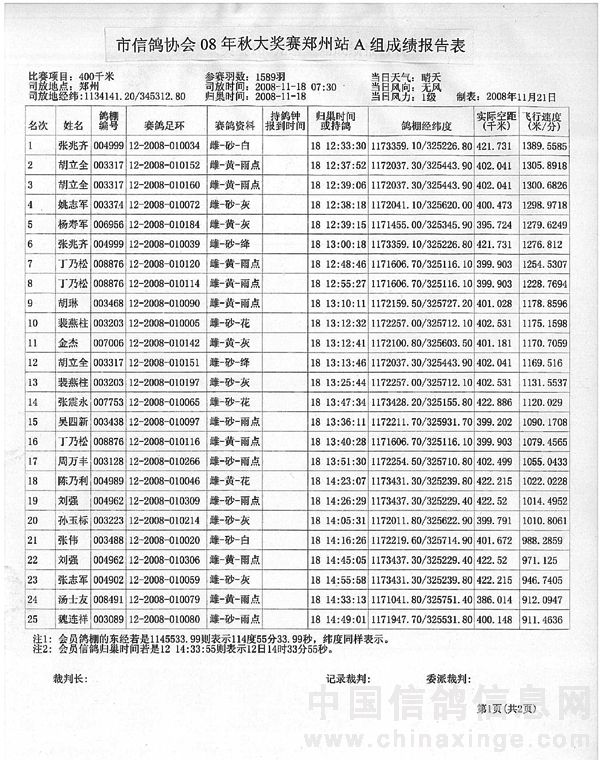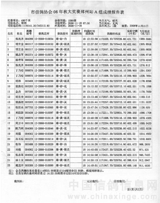 蚌埠市信鸽协会郑州站大奖赛A组竞赛成绩