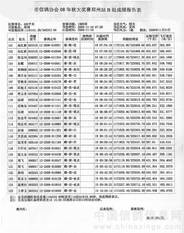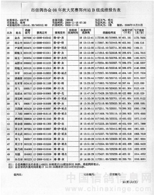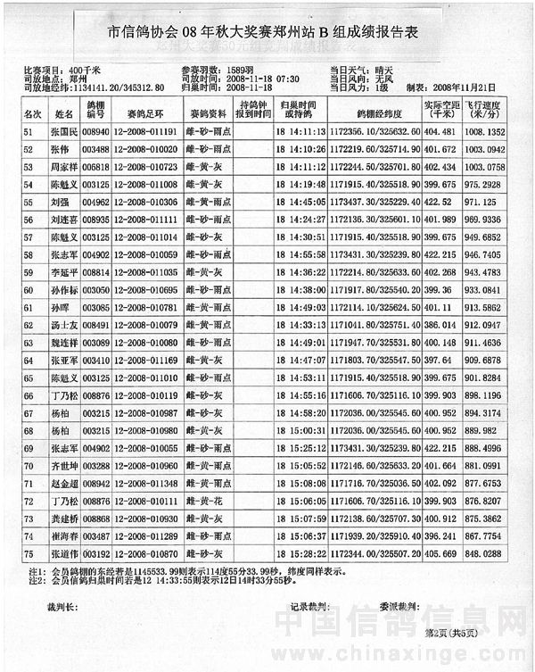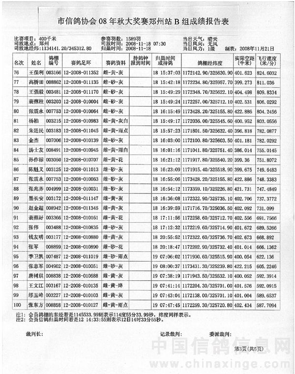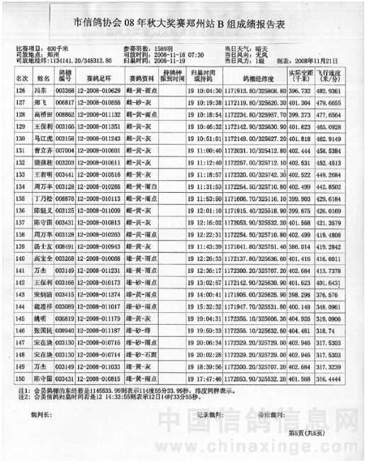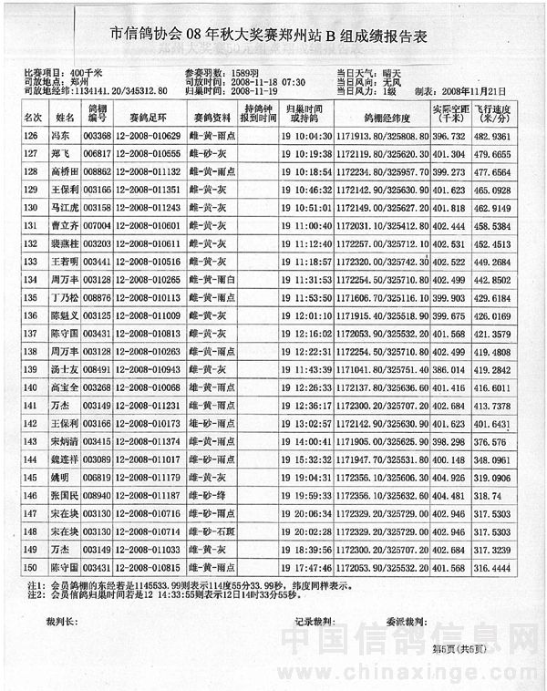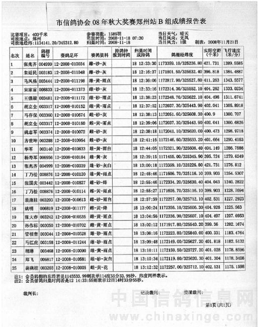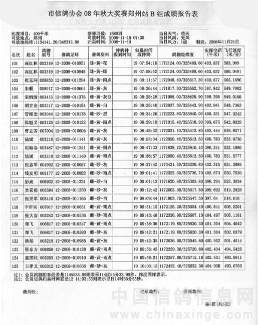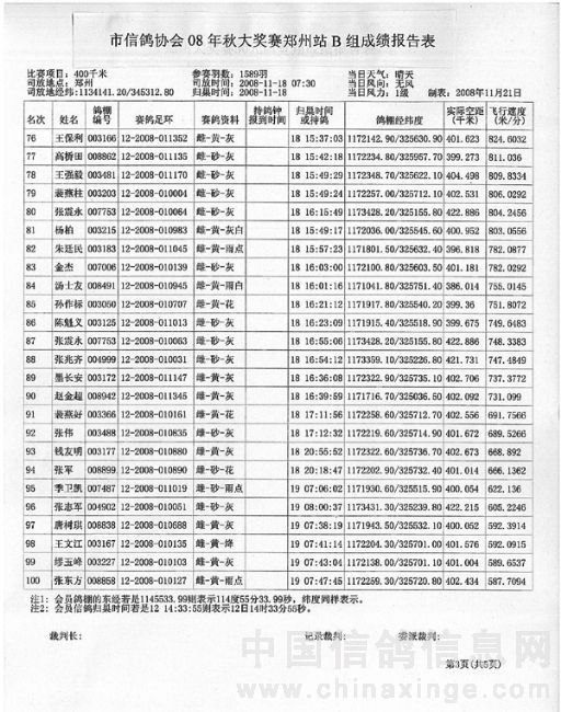 蚌埠信鸽协会郑州站大奖赛B组竞赛成绩
