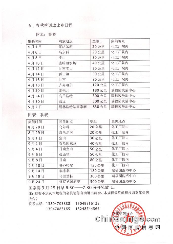 莫旗信鸽协会2016年春、秋季训放竞翔计划