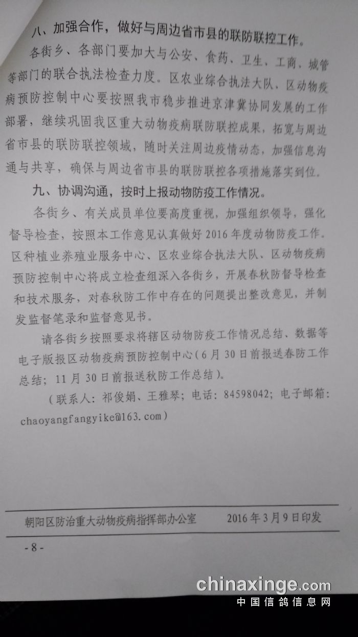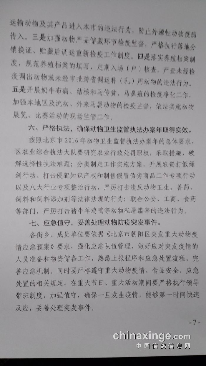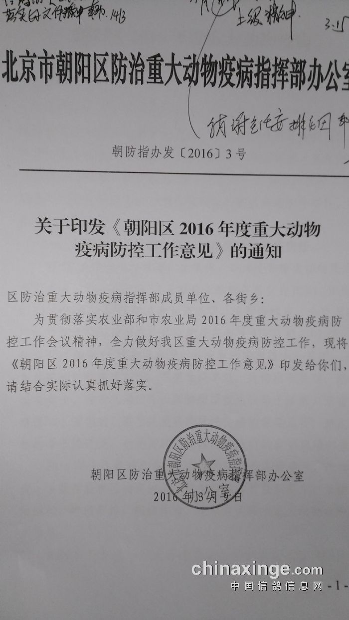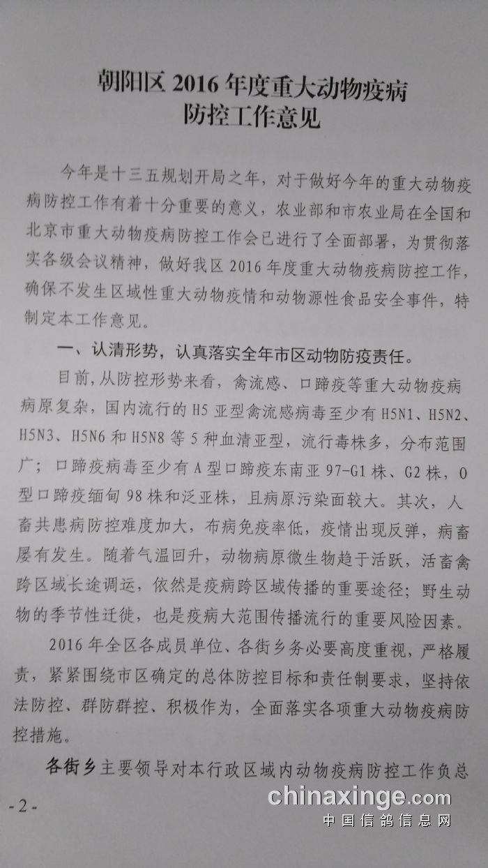 关于《朝阳区2016年度重大动物疫病防控工作意见》的通知
