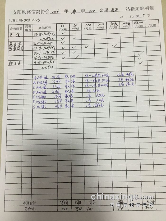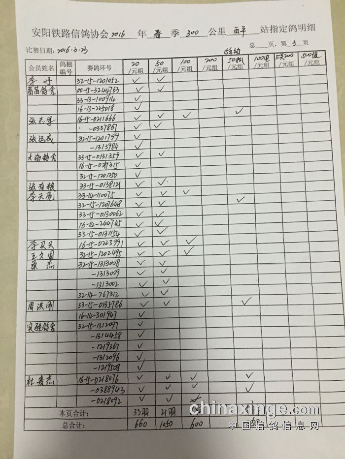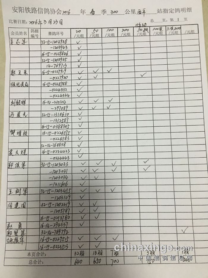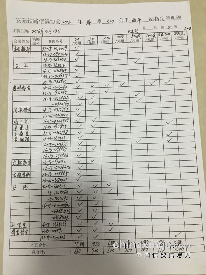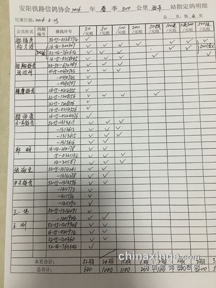 2016年春300公里西平站指定鸽明细