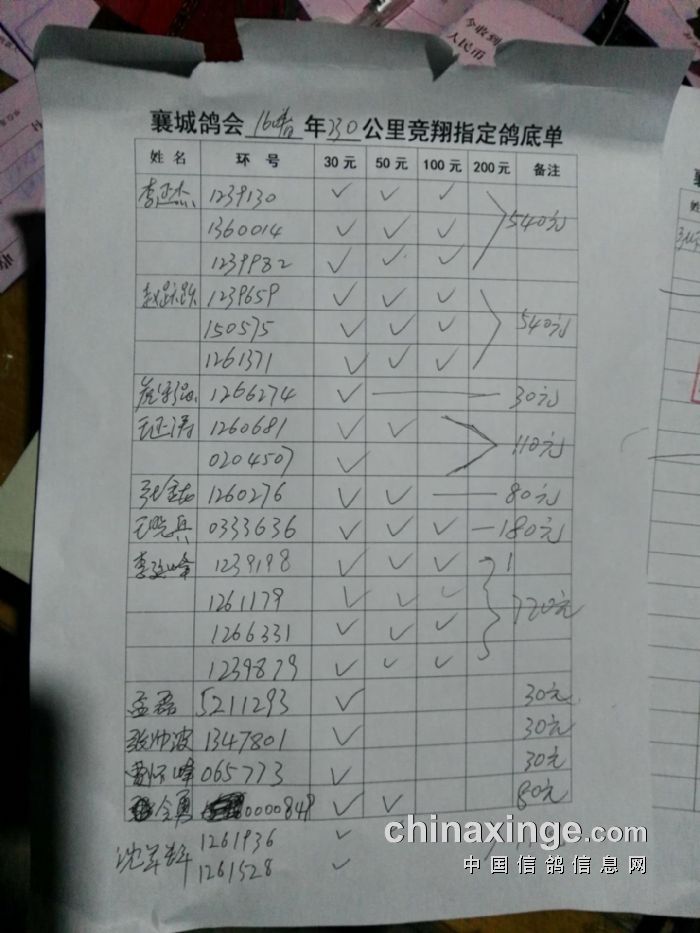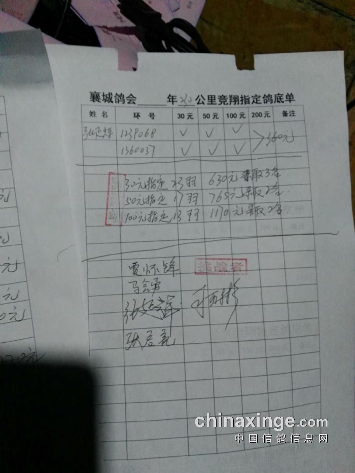 襄城县信鸽协会230公里指定鸽底单