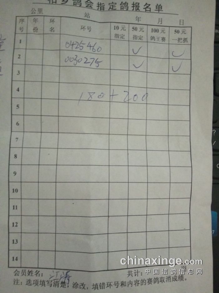 由于工作疏忽漏等鸽友江涛指定鸽单现上传原始指定鸽单