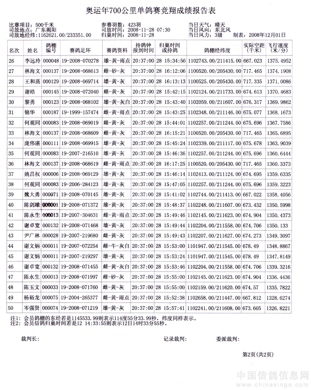 湛江市信鸽协会2008年秋700公里成绩(二)