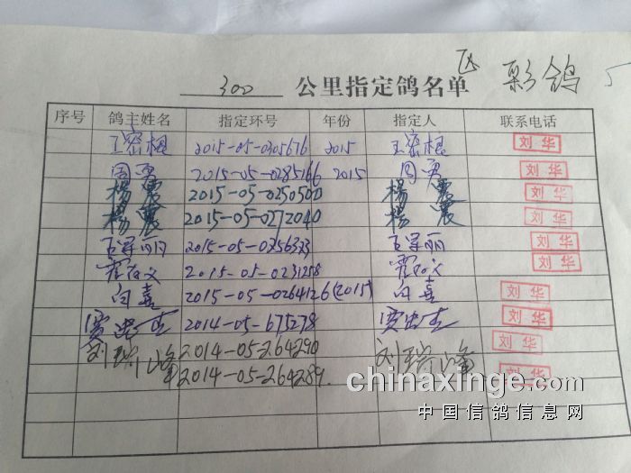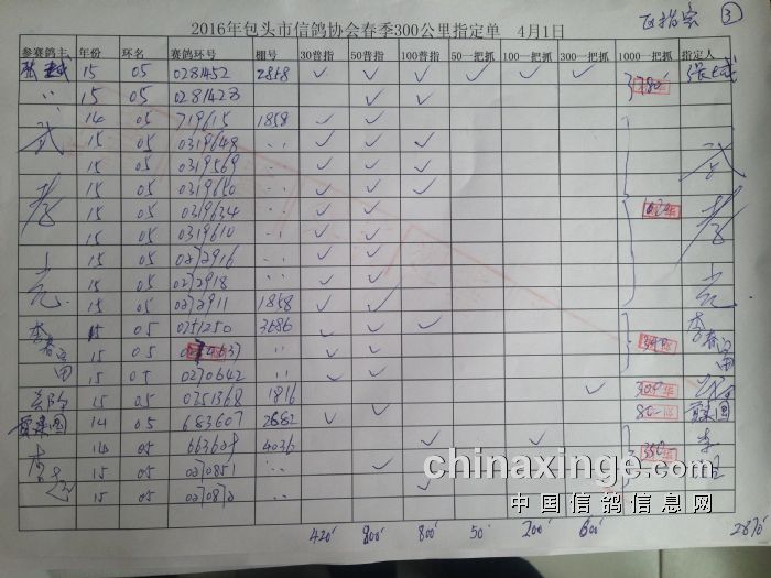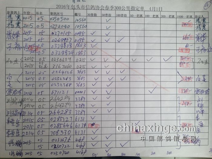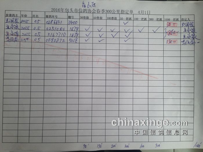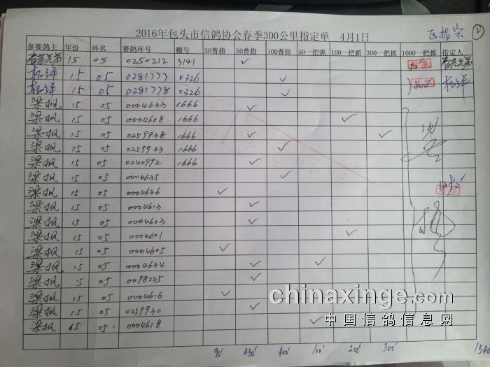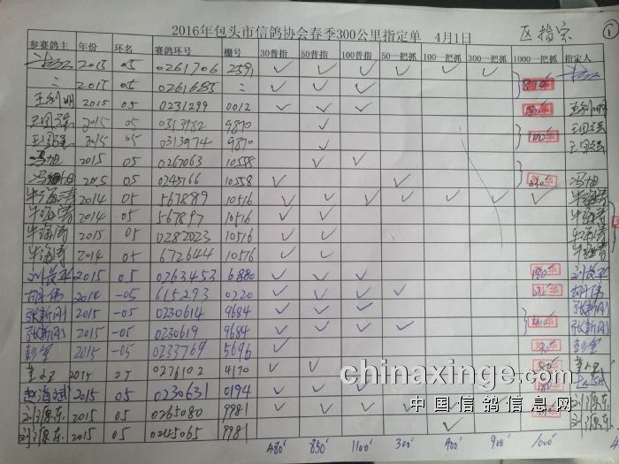 2016年包头市信鸽协会春季300公里青山区指定明细