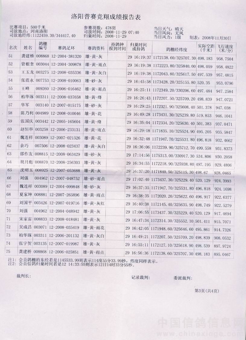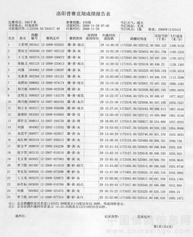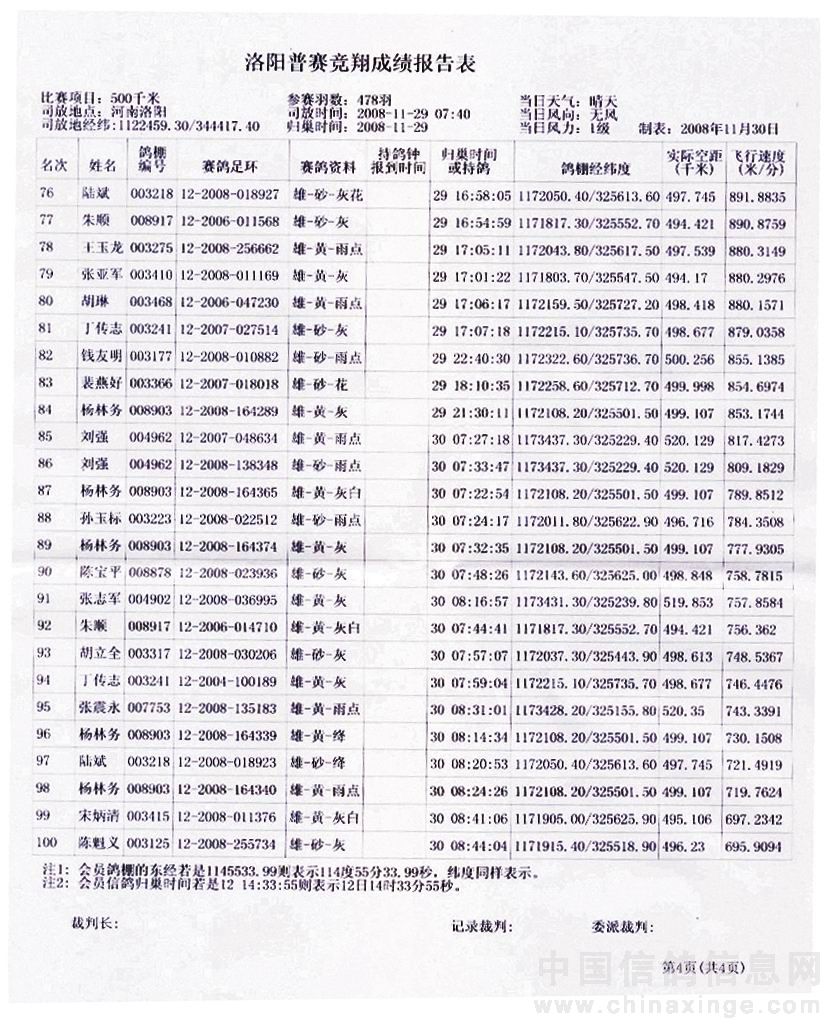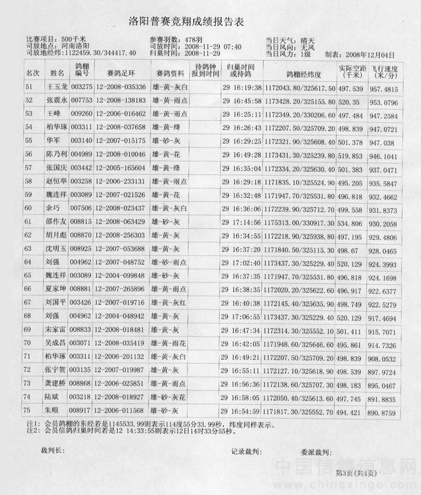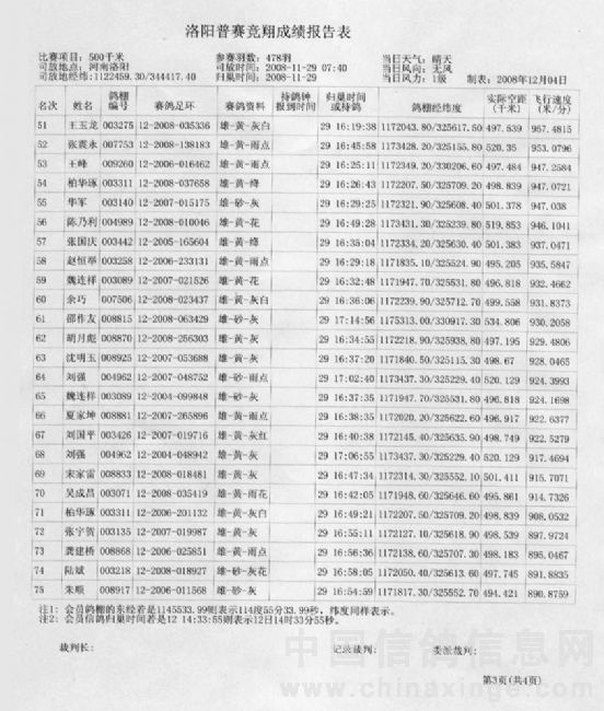 蚌埠信鸽协会08年秋洛阳站竞赛成绩